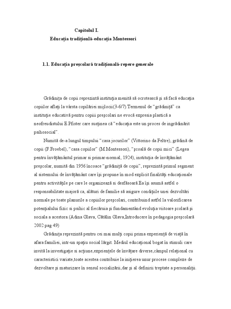 Idealul educaional al colii romneti l reprezint dezvoltarea liber, integral i armonioas a individualitii umane n formarea personalitii autonome i creative. Educaia numai atunci este eficace, cnd trateaz pe fiecare conform cu natura sa i cnd d fiecruia hrana mintal de care are nevoie. ([Link]) . nvmntul precolar romnesc se numr printre subsistemele de nvmnt cu cea mai lung tradiie, care nc de la nceputuri a rspuns prompt noutilor din domeniul educaiei copiilor mici. Primele exemple i poate cele mai semnificative sunt cele care privesc absorbia rapid a ideilor pedagogiei froebeliene (n a doua jumtate a secolului al XIX-lea) i ale pedagogiei montessoriene (n prima jumtate a secolului al XX-lea) n spaiul educaiei copilului mic. Ambele curente au avut un