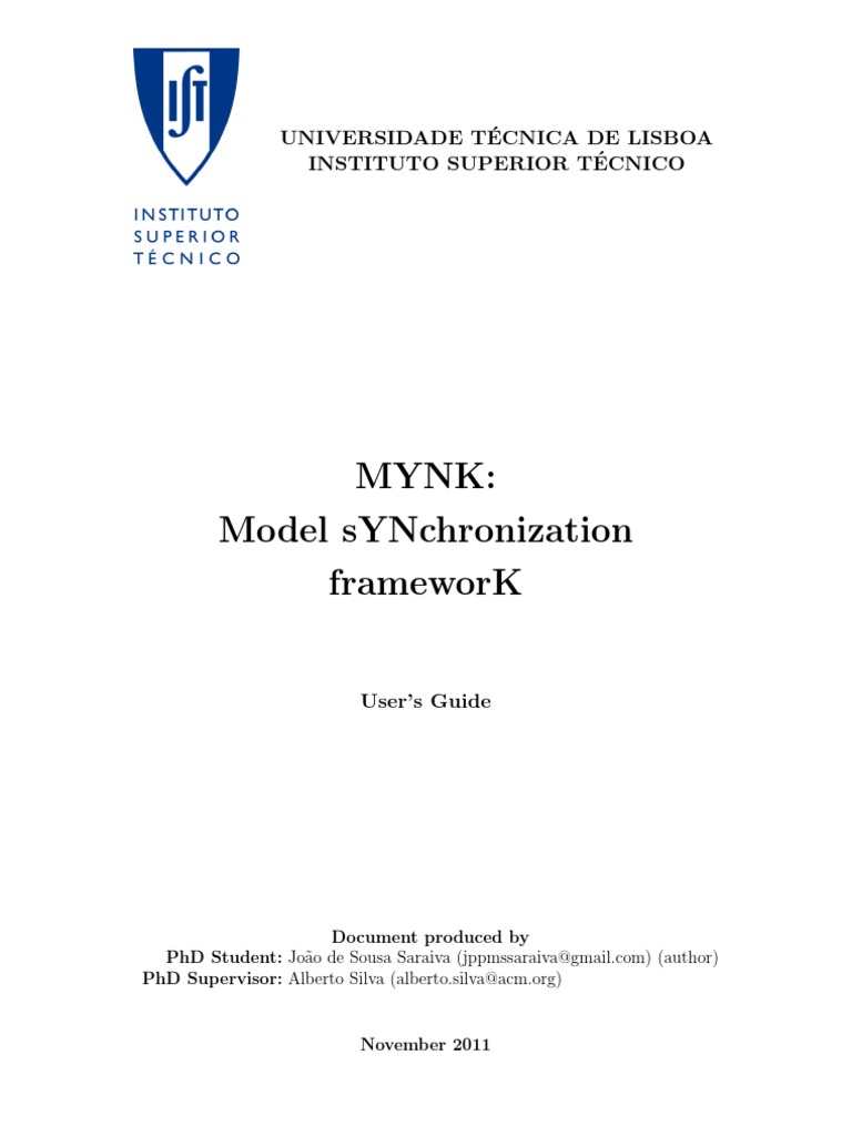 Figure 1.2: Possible synchronization scenarios. which should be performed until a xed-point is reached (i.e., the application of a set of changes to a certain model results in that same model). The way in which MYNK operates can be considered analogous to a variety of tools and practices, of which we highlight some illustrative examples in the following paragraphs. The notion of capture-replay testing consists of recording events and applying them again, at a later point in time. These tests are often used in automated software testing scenarios (particularly in regression and UI testing), and are done by (1) recording a sequence of events and their expected results, (2) simulating the occurrence of those recorded events, and (3) evaluating whether the results are equivalent to the ones expected. An analogy can be found in MYNK, when considering such events to be model changes. MYNKs change propagation process is also very similar to what happens in a Revision Control System (RCS) such as Subversion or Mercurial: the only information that goes to or comes from the developers working copy is a set of deltas (i.e., dierences) between the most recent version of the artifact and the version that is on the developers working copy. A developer can (1) make changes to her own working copy, and (2) merge changes from other developers working copies with her own, in order to keep synchronized with the rest of the development team. Another adequate metaphor for this process is the pantograph, a tool that links two pens so that any movement to one of the pens is automatically reproduced (possibly with a dierent scale) by the other pen. This metaphor is particularly interesting, as MYNK operates much like a pantograph, by taking changes to one model and automatically reproducing them on another model. 3