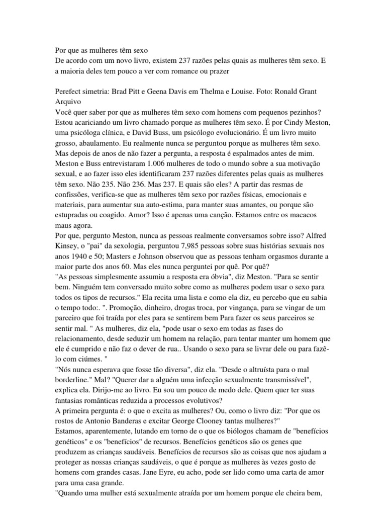 E a maioria deles tem pouco a ver com romance ou prazer Perefect simetria: Brad Pitt e Geena Davis em Thelma e Louise. Foto: Ronald Grant Arquivo Voc quer saber por que as mulheres tm sexo com homens com pequenos pezinhos? Estou acariciando um livro chamado porque as mulheres tm sexo. por Cindy Meston, uma psicloga clnica, e David Buss, um psiclogo evolucionrio. um livro muito grosso, abaulamento. Eu realmente nunca se perguntou porque as mulheres tm sexo. Mas depois de anos de no fazer a pergunta, a resposta espalmados antes de mim. Meston e Buss entrevistaram 1.006 mulheres de todo o mundo sobre a sua motivao sexual, e ao fazer isso eles identificaram 237 razes diferentes pelas quais as mulheres tm sexo. No 235. No 236. Mas 237. E quais so eles? A partir das resmas de confisses, verifica-se que as mulheres tm sexo por razes fsicas, emocionais e materiais, para aumentar sua auto-estima, para manter suas amantes, ou porque so estupradas ou coagido. Amor? Isso apenas uma cano. Estamos entre os macacos maus agora. Por que, pergunto Meston, nunca as pessoas realmente conversamos sobre isso? Alfred Kinsey, o "pai" da sexologia, perguntou 7,985 pessoas sobre suas histrias sexuais nos anos 1940 e 50; Masters e Johnson observou que as pessoas tenham orgasmos durante a maior parte dos anos 60. Mas eles nunca perguntei por qu. Por qu? "As pessoas simplesmente assumiu a resposta era bvia", diz Meston. "Para se sentir bem. Ningum tem conversado muito sobre como as mulheres podem usar o sexo para todos os tipos de recursos." Ela recita uma lista e como ela diz, eu percebo que eu sabia o tempo todo:. ". Promoo, dinheiro, drogas troca, por vingana, para se vingar de um parceiro que foi trada por eles para se sentirem bem Para fazer os seus parceiros se sentir mal. " As mulheres, diz ela, "pode usar o sexo em todas as fases do relacionamento, desde seduzir um homem na relao, para tentar manter um homem que ele cumprido e no faz o dever de rua.. Usando o sexo para se livrar dele ou para fazlo com cimes. " "Ns nunca esperava que fosse to diversa", diz ela. "Desde o altrusta para o mal borderline." Mal? "Querer dar a algum uma infeco sexualmente transmissvel", explica ela. Dirijo-me ao livro. Eu sou um pouco de medo dele. Quem quer ter suas fantasias romnticas reduzida a processos evolutivos? A primeira pergunta : o que o excita as mulheres? Ou, como o livro diz: "Por que os rostos de Antonio Banderas e excitar George Clooney tantas mulheres?" Estamos, aparentemente, lutando em torno de o que os bilogos chamam de "benefcios genticos" e os "benefcios" de recursos. Benefcios genticos so os genes que produzem as crianas saudveis. Benefcios de recursos so as coisas que nos ajudam a proteger as nossas crianas saudveis, o que porque as mulheres s vezes gosto de homens com grandes casas. Jane Eyre, eu acho, pode ser lido como uma carta de amor para uma casa grande. "Quando uma mulher est sexualmente atrada por um homem porque ele cheira bem,