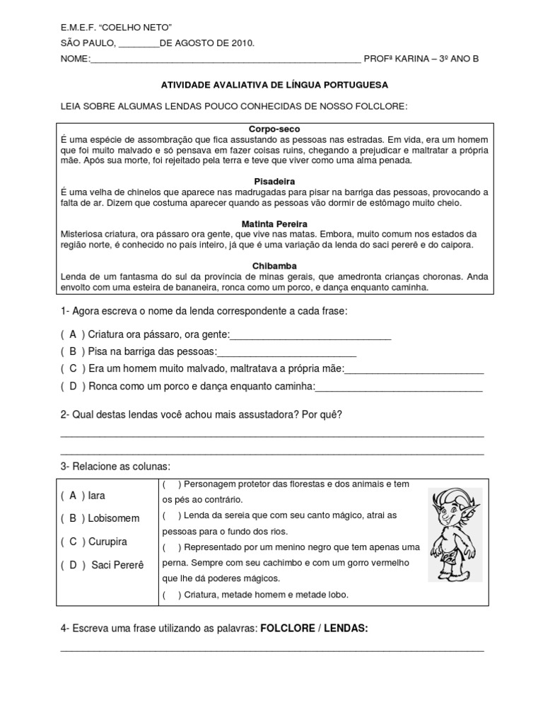 NOME:_____________________________________________________ PROF KARINA 3 ANO B ATIVIDADE AVALIATIVA DE LNGUA PORTUGUESA LEIA SOBRE ALGUMAS LENDAS POUCO CONHECIDAS DE NOSSO FOLCLORE: Corpo-seco uma espcie de assombrao que fica assustando as pessoas nas estradas. Em vida, era um homem que foi muito malvado e s pensava em fazer coisas ruins, chegando a prejudicar e maltratar a prpria me. Aps sua morte, foi rejeitado pela terra e teve que viver como uma alma penada. Pisadeira uma velha de chinelos que aparece nas madrugadas para pisar na barriga das pessoas, provocando a falta de ar. Dizem que costuma aparecer quando as pessoas vo dormir de estmago muito cheio. Matinta Pereira Misteriosa criatura, ora pssaro ora gente, que vive nas matas. Embora, muito comum nos estados da regio norte, conhecido no pas inteiro, j que uma variao da lenda do saci perer e do caipora. Chibamba Lenda de um fantasma do sul da provncia de minas gerais, que amedronta crianas choronas. Anda envolto com uma esteira de bananeira, ronca como um porco, e dana enquanto caminha.