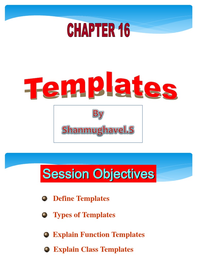 // TEMPLATES DEFINITION #include<iostream.h> #include<conio.h> template <class T> T max(T x,T y) { return(x>y)?x:y; }; void main() { clrscr(); cout<<max(17,19)<<endl; cout<<max(1.5,6.7)<<endl; cout<<max('A','B')<<endl; getch(); }