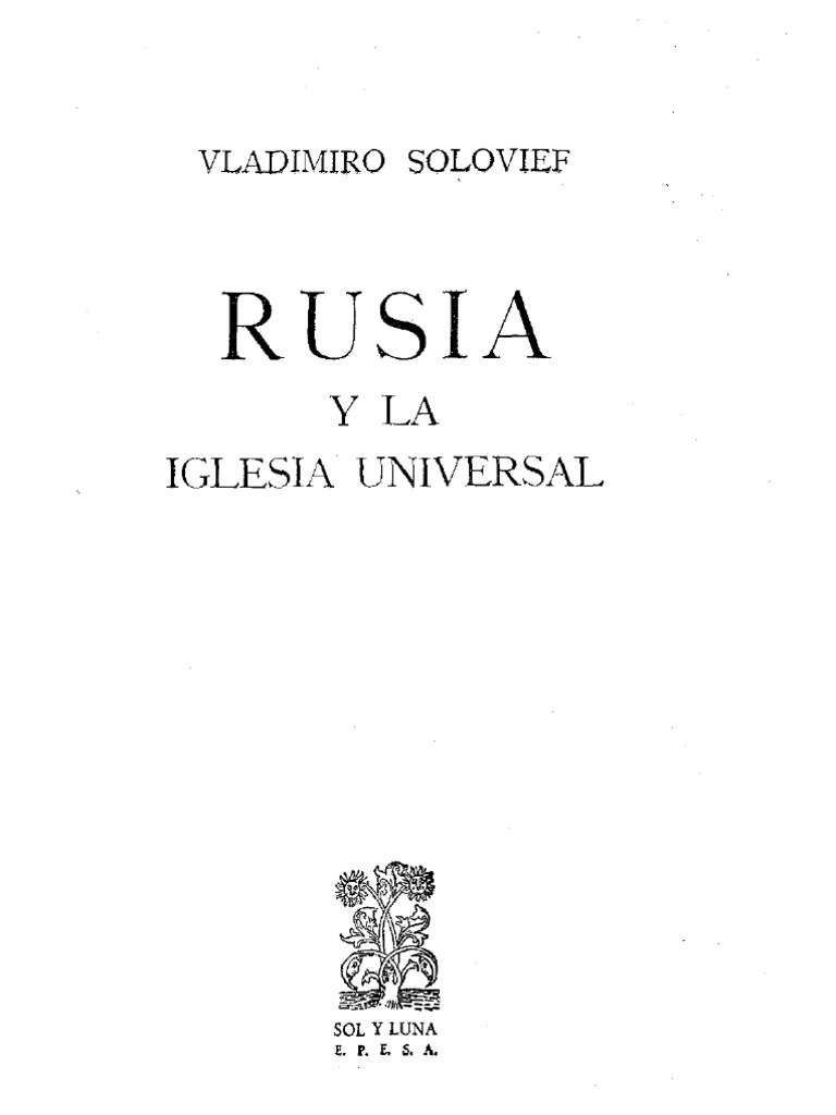 tir en ellos. Si ya al sealarnos sus frutos nos haba Solovief del militarismo universal que transforma pueblos enteros en ejrcitos enemigos, de antagonismos sociales profundos e irreconciliables, del relajamiento progresivo de toda fuerza moral en los individuos revelado en el nmero siempre creciente de locuras, crmenes y suicidios, q u habra pensado ahora, al contemplar los horrores en que, presa de incontenible angustia, se debate la Humanidad entera, y el odio, verdaderamente diablico en su abyeccin, sobre el cual, como sobre cimiento seguro, piensan los actuales insensatos dirigentes de la poltica internacional edificar el orden futuro del gnero humano? Ante el fracaso ms o menos definitivo de bizantinos y germanos, Solovief vuelve sus miradas hacia la patria. No sera, tal vez, ella, la sania Rusia, en oposicin al Occidente laico y ateo, la nacin destinada por la Providencia para asumir, en definitiva conjugacin con la Iglesia, la misin de cabeza temporal de la cristiandad ? En el carcter profundamente monrquico del pueblo ruso, unido a ciertos hechos profetices de su pasado, as como en la masa enorme y compacta de su Imperio, junto con el contraste que ofrece la pobreza y el vaco de su existencia actual actual entonces s se les compara con la gran fuerza latente de su espritu nacional, ve Solovief otros tantos sntomas precursores de la misin providencial de su patria. Y como mientras se encuentre fuera de la Unidad, no puede pensarse en la trascendental colaboracin, todos los deseos del filsofo son de que cuanto antes d aqulla el paso decisivo, el que vendr a valorizar sus actualmente estriles a la par que innegables cualidades, convirtindolas en otros tantos instrumentos eficaces para la instauracin, en este valle de lgrimas, del reino de Dios. Toda esta argumentacin de tipo histrico, maravillosamente conducida por Solovief en a introduccin de su R U S I A Y LA IGLESIA UNIVERSAL, viene a justificarse en la concepcin que nuestro pensador tiene de la Iglesia, concepcin asombrosa en su hondura