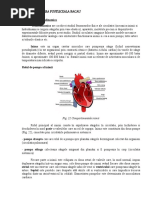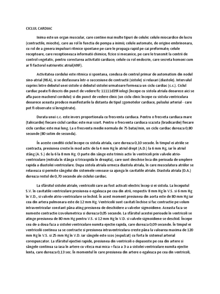 (contractile, miocite), care au rol n functia de pompa a inimii; celule automate, de origine embrinonara, cu rol de a genera impulsuri ritmice spontane pe care le propaga rapid pe cai preformate; celule receptoare, care receptioneaza informatii chimice, fizice si mecanice, pe care le transmit la centrii de control vegetativ, pentru corectarea activitatii cardiace; celule cu rol endocrin, care secreta homoni cum ar fi factorul natriuretic atrial(ANF). Activitatea cordului este ritmica si spontana, condusa de centrul primar de automatism din nodul sino-atrial (NSA), si se desfasoara ntr-o succesiune de contractii (sistole) si relaxari (diastole). Intervalul cuprins ntre debutul unei sistole si debutul sistolei urmatoare formeaza un ciclu cardiac (c.c.). Ciclul cardiac poate fi descris din punct de vedere fiz 11111d39l iologi (ncepe cu sistola atriala deoarece aici se afla pace-mackerul cordului) si din punct de vedere clinic (un ciclu clinic ncepe cu sistola ventriculara deoarece aceasta produce manifestarile la distanta de tipul zgomotelor cardiace, pulsului arterial - care pot fi observate si nregistrate). Durata unui c.c. este invers proportionala cu frecventa cardiaca. Pentru o frecveta cardiaca mare (tahicardie) fiecare ciclul cardiac este mai scurt. Pentru o frecventa cardiaca scazuta (bradicardie) fiecare ciclu cardiac este mai lung. La o frecventa medie normala de 75 batai/min, un ciclu cardiac dureaza 0,80 secunde (80 sutim de secunda). n aceste conditii ciclul ncepe cu sistola atriala, care dureaza 0,10 secude. n timpul ei atriile se contracta, presiunea creste n mod activ de la 4 mm Hg n atriul drept (A.D.) la 6 mm Hg, iar n atriul stng (A. S.) de la 6 la 8 mm Hg. O parte din snge este trimis activ n ventricoli prin valvele atrioventriculare (mitrala n stnga si tricuspida n dreapta), care sunt deschise nca din perioada de umplere rapida a diastolei ventriculare. Dupa sistola atriala urmeza diastola atriala, n care musculatura atriilor se relaxeaza si permite sngelui din sistemele venoase sa ajunga n cavitatile atriale. Diastola atriala (D.A.) dureaza restul de 0,70 secunde ale ciclului cardiac. La sfrsitul sistolei atriale, ventricolii care au fost activati electric ncep si ei sistola. La nceputul S.V. n cavitatile ventriculare presiunea o egaleaza pe cea din atrii, respectiv 8 mm Hg n V.S. si 6 mm Hg n V.D., si valvele atrio-ventriculare se nchid. n acest moment presiunea din aorta este de 80 mm Hg iar cea din artera pulmonara este de 12 mm Hg. Ventricolii sunt cavitati nchise si fac contractie pe volum intraventricular constant pna ating presiunea de deschidere a valvelor sigmoidiene. Aceasta faza se numeste contractie izovolumetrica si dureaza 0,05 secunde. La sfrsitul acestei perioade n ventricoli se atinge presiunea de 80 mm Hg pentru V.S. si 12 mm Hg n V.D. si valvele sigmoidiene se deschid. ncepe cea de-a doua faza a sistolei ventriculare numita ejectie rapida, care dureaza 0,09 secunde. n timpul ei ventricolii continua sa se contracte si presiunea intraventriculara creste pna la valoarea maxima de 120 mm Hg n V.S. si 25 mm Hg n V.D. iar sngele este scos (expulzat) cu forta n sistemul arterial corespunzator. La sfrsitul ejectiei rapide, presiunea din ventricoli o depaseste pe cea din artere si sngele continua sa iasa n artere cu viteza mai mica = faza a 3-a a sistolei ventriculare numita ejectie lenta, care dureaza 0,13 sec. n momentul n care presiunea din artere o egaleaza pe cea din ventricoli,