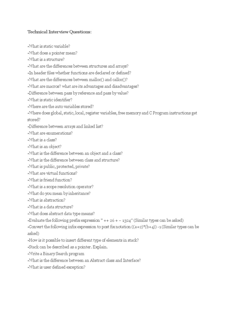 What are the differences between structures and arrays? In header files whether functions are declared or defined? What are the differences between malloc() and calloc()? What are macros? what are its advantages and disadvantages? Difference between pass by reference and pass by value? What is static identifier? Where are the auto variables stored? Where does global, static, local, register variables, free memory and C Program instructions get stored? Difference between arrays and linked list? What are enumerations? What is a class? What is an object? What is the difference between an object and a class? What is the difference between class and structure? What is public, protected, private? What are virtual functions? What is friend function? What is a scope resolution operator? What do you mean by inheritance? What is abstraction? What is a data structure? What does abstract data type means? Evaluate the following prefix expression ++ 26 + 1324 (Similar types can be asked) Convert the following infix expression to post fix notation ((a+2)*(b+4)) -1 (Similar types can be asked) How is it possible to insert different type of elements in stack? Stack can be described as a pointer. Explain. Write a Binary Search program What is the difference between an Abstract class and Interface? What is user defined exception?