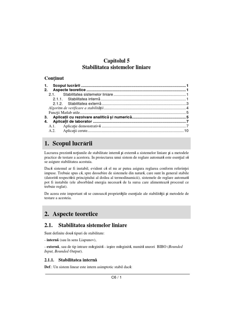 Lucrarea prezint noiunile de stabilitate intern i extern a sistemelor liniare i a metodele