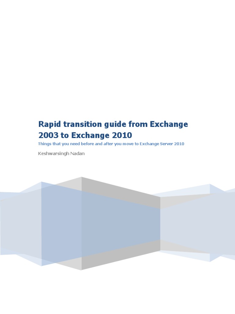 This guide will walk you through the most important considerations and steps that you need to perform before, during, and after the deployment of Exchange 2010 server. This guide is written for the IT administrators of an existing Exchange 2003 organization which contains small to medium scale deployments. This guide mainly focuses on a typical transition of Exchange 2003 to Exchange 2010 environment which includes the transition of Exchange 2003 backend and front end servers to Exchange 2010 mailbox server role, client access server role and hub transport server role installed using the typical installation method. This guide does not discuss about implementation of Unified Messaging Server Role. It is presumed that the readers of this guide has good understanding of Exchange 2003 and Exchange 2010 functionality or have hands on experience on both. If you are new to Exchange Server 2010; it is highly recommended that you stop by and read the recommended articles in Recommended Articles section of this guide. To prevent complexities while following the steps shown in this guide, configuration for complex exchange deployments have intentionally been omitted. To keep this document simple and compact we have used command line mode to setup Exchange Server 2010.
