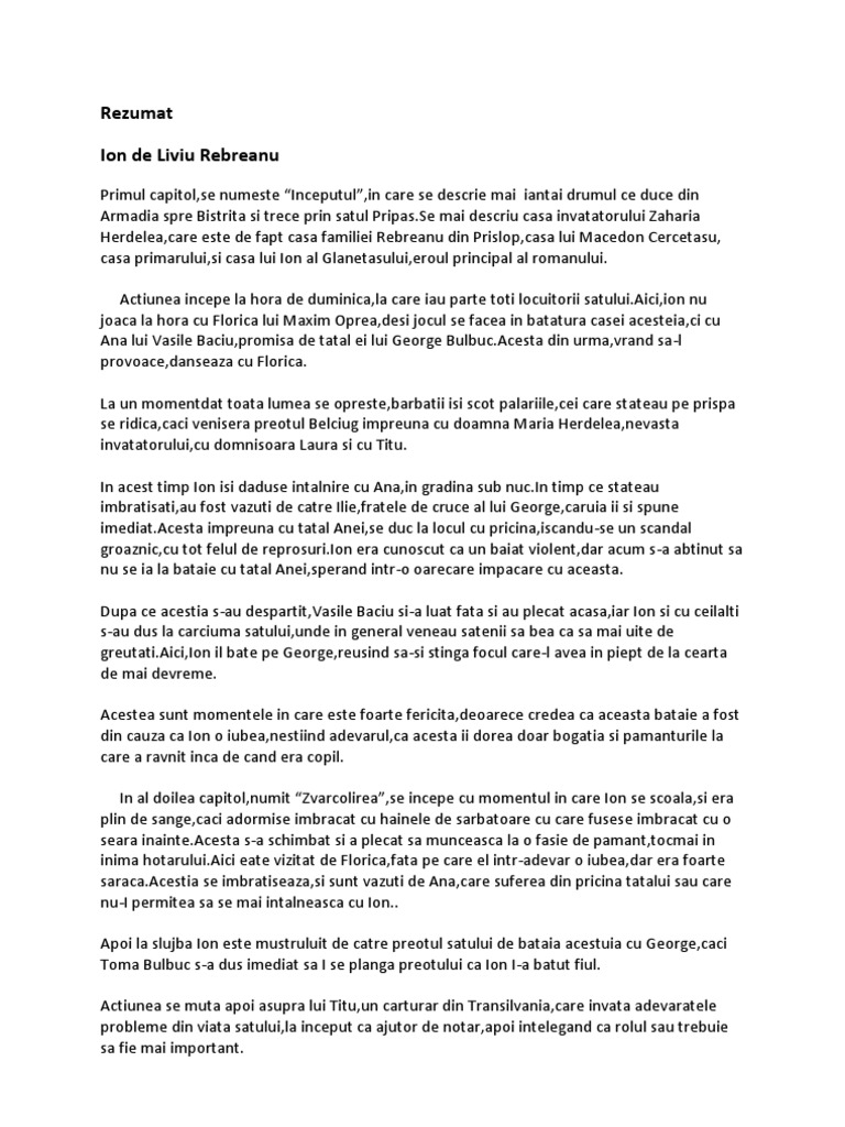 Primul capitol,se numeste Inceputul,in care se descrie mai iantai drumul ce duce din Armadia spre Bistrita si trece prin satul [Link] mai descriu casa invatatorului Zaharia Herdelea,care este de fapt casa familiei Rebreanu din Prislop,casa lui Macedon Cercetasu, casa primarului,si casa lui Ion al Glanetasului,eroul principal al romanului. Actiunea incepe la hora de duminica,la care iau parte toti locuitorii [Link],ion nu joaca la hora cu Florica lui Maxim Oprea,desi jocul se facea in batatura casei acesteia,ci cu Ana lui Vasile Baciu,promisa de tatal ei lui George [Link] din urma,vrand sa-l provoace,danseaza cu Florica. La un momentdat toata lumea se opreste,barbatii isi scot palariile,cei care stateau pe prispa se ridica,caci venisera preotul Belciug impreuna cu doamna Maria Herdelea,nevasta invatatorului,cu domnisoara Laura si cu Titu. In acest timp Ion isi daduse intalnire cu Ana,in gradina sub [Link] timp ce stateau imbratisati,au fost vazuti de catre Ilie,fratele de cruce al lui George,caruia ii si spune [Link] impreuna cu tatal Anei,se duc la locul cu pricina,iscandu-se un scandal groaznic,cu tot felul de [Link] era cunoscut ca un baiat violent,dar acum s-a abtinut sa nu se ia la bataie cu tatal Anei,sperand intr-o oarecare impacare cu aceasta. Dupa ce acestia s-au despartit,Vasile Baciu si-a luat fata si au plecat acasa,iar Ion si cu ceilalti s-au dus la carciuma satului,unde in general veneau satenii sa bea ca sa mai uite de [Link],Ion il bate pe George,reusind sa-si stinga focul care-l avea in piept de la cearta de mai devreme. Acestea sunt momentele in care este foarte fericita,deoarece credea ca aceasta bataie a fost din cauza ca Ion o iubea,nestiind adevarul,ca acesta ii dorea doar bogatia si pamanturile la care a ravnit inca de cand era copil. In al doilea capitol,numit Zvarcolirea,se incepe cu momentul in care Ion se scoala,si era plin de sange,caci adormise imbracat cu hainele de sarbatoare cu care fusese imbracat cu o seara [Link] s-a schimbat si a plecat sa munceasca la o fasie de pamant,tocmai in inima [Link] eate vizitat de Florica,fata pe care el intr-adevar o iubea,dar era foarte [Link] se imbratiseaza,si sunt vazuti de Ana,care suferea din pricina tatalui sau care nu-I permitea sa se mai intalneasca cu Ion.. Apoi la slujba Ion este mustruluit de catre preotul satului de bataia acestuia cu George,caci Toma Bulbuc s-a dus imediat sa I se planga preotului ca Ion I-a batut fiul. Actiunea se muta apoi asupra lui Titu,un carturar din Transilvania,care invata adevaratele probleme din viata satului,la inceput ca ajutor de notar,apoi intelegand ca rolul sau trebuie sa fie mai important.