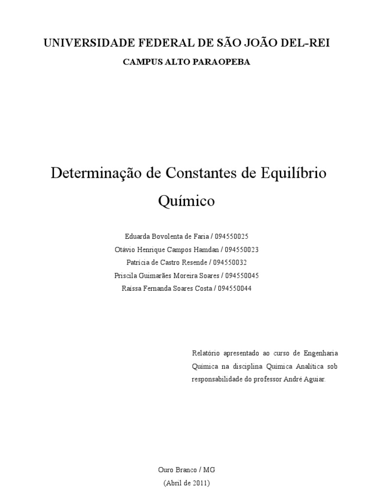 Relatrio apresentado ao curso de Engenharia Qumica na disciplina Qumica Analtica sob responsabilidade do professor Andr Aguiar.