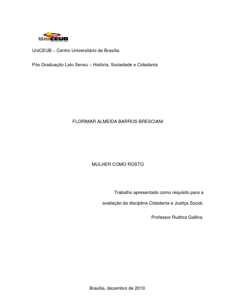 comear pelo seu primeiro papel, o papel de acolhedora, de cuidadora da famlia. Quando a mulher decidiu encarar o Eu (o masculino) e seu mundo, no abriu mo de ser a me, a mulher, a dona de casa, mas procurou buscar uma parceria com o mundo masculino. No entanto, se os servios sociais atingem um nvel precrio a mulher quem acaba perdendo nessa parceria. Por exemplo, se um casal que trabalha e tem filhos pequenos, e se um dia esse mesmo casal no tem disposio os servios de uma creche para as crianas, ser a mulher que abrir mo de ir ao trabalho para voltar ao seu papel primrio. Por isso, dentre tantas reivindicaes, a luta da mulher por creches para seus filhos faz parte do que chamamos de Justia Social. Este exemplo apenas uma ilustrao das situaes pelas quais passam as mulheres na luta pelo seu reconhecimento. Hoje, como resultado de muitas lutas, as polticas sociais se orientam em torno do objetivo de promover a igualdade social. Contudo, a mulher ainda tem pela frente o desafio, bem como o compromisso, de deixar para filhas e netas a herana concreta de suas lutas como o Outro no mundo do Eu masculino. E ao final, tambm ser responsabilidade da mulher de hoje a garantia das condies sociais dos que viro, dos que nos transcendero, pois ter responsabilidade com outrem o que nos faz seres morais e ticos.13 A mulher j conseguiu dar passos considerveis no caminho pela igualdade e pela Justia Social. Em nosso pas, graas pertincia das mulheres, j temos um plano de poltica nacional para atender algumas de suas demandas, com garantias de participao da mulher em vrios mbitos da sociedade. Mais que isso, a garantia de reconhecimento do Rosto da mulher. No pensamento levinasiano, o