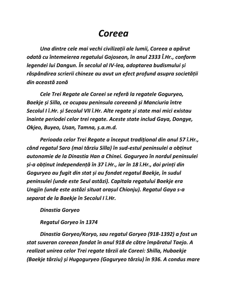 Una dintre cele mai vechi civilizaii ale lumii, Coreea a aprut odat cu ntemeierea regatului Gojoseon, n anul 2333 .Hr., conform legendei lui Dangun. n secolul al IV-lea, adoptarea budismului i rspndirea scrierii chineze au avut un efect profund asupra societii din aceast zon Cele Trei Regate ale Coreei se refer la regatele Goguryeo, Baekje i Silla, ce ocupau peninsula coreean i Manciuria ntre Secolul I .Hr. i Secolul VII .Hr. Alte regate i state mai mici existau nainte periodei celor trei regate. Aceste state includ Gaya, Dongye, Okjeo, Buyeo, Usan, Tamna, .a.m.d. Perioada celor Trei Regate a nceput tradiional din anul 57 .Hr., cnd regatul Saro (mai trziu Silla) n sud-estul peninsulei a obinut autonomie de la Dinastia Han a Chinei. Goguryeo n nordul peninsulei i-a obinut independen n 37 .Hr., iar n 18 .Hr., doi prini din Goguryeo au fugit din stat i au fondat regatul Baekje, n sudul peninsulei (unde este Seul astzi). Capitala regatului Baekje era Ungjin (unde este astzi situat oraul Chionju). Regatul Gaya s-a separat de la Baekje n Secolul I .Hr. Dinastia Goryeo Regatul Goryeo n 1374 Dinastia Goryeo/Koryo, sau regatul Goryeo (918-1392) a fost un stat suveran coreean fondat n anul 918 de ctre mpratul Taejo. A realizat unirea celor Trei regate trzii ale Coreei: Shilla, Hubaekje (Baekje trziu) i Hugoguryeo (Goguryeo trziu) n 936. A condus mare