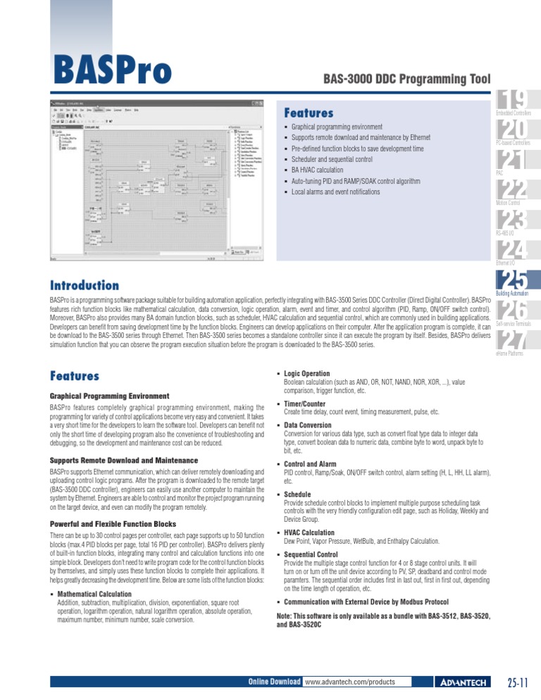 Logic Operation Boolean calculation (such as AND, OR, NOT, NAND, NOR, XOR, ...), value comparison, trigger function, etc. Timer/Counter Create time delay, count event, timing measurement, pulse, etc. Data Conversion Conversion for various data type, such as convert float type data to integer data type, convert boolean data to numeric data, combine byte to word, unpack byte to bit, etc. Control and Alarm PID control, Ramp/Soak, ON/OFF switch control, alarm setting (H, L, HH, LL alarm), etc. Schedule Provide schedule control blocks to implement multiple purpose scheduling task controls with the very friendly configuration edit page, such as Holiday, Weekly and Device Group. HVAC Calculation Dew Point, Vapor Pressure, WetBulb, and Enthalpy Calculation. Sequential Control Provide the multiple stage control function for 4 or 8 stage control units. It will turn on or turn off the unit device according to PV, SP, deadband and control mode paramters. The sequential order includes first in last out, first in first out, depending on the time length of operation, etc. Communication with External Device by Modbus Protocol Note: This software is only available as a bundle with BAS-3512, BAS-3520, and BAS-3520C