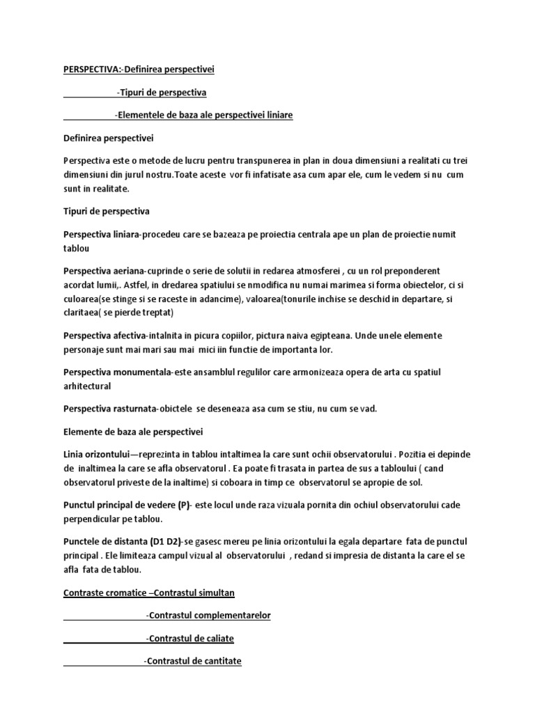 pentru transpunerea in plan in doua dimensiuni a realitati cu trei dimensiuni din jurul [Link] aceste vor fi infatisate asa cum apar ele, cum le vedem si nu cum sunt in realitate. Tipuri de perspectiva Perspectiva liniara-procedeu care se bazeaza pe proiectia centrala ape un plan de proiectie numit tablou Perspectiva aeriana-cuprinde o serie de solutii in redarea atmosferei , cu un rol preponderent acordat lumii,. Astfel, in dredarea spatiului se nmodifica nu numai marimea si forma obiectelor, ci si culoarea(se stinge si se raceste in adancime), valoarea(tonurile inchise se deschid in departare, si claritaea( se pierde treptat) Perspectiva afectiva-intalnita in picura copiilor, pictura naiva egipteana. Unde unele elemente personaje sunt mai mari sau mai mici iin functie de importanta lor. Perspectiva monumentala-este ansamblul regulilor care armonizeaza opera de arta cu spatiul arhitectural Perspectiva rasturnata-obictele se deseneaza asa cum se stiu, nu cum se vad. Elemente de baza ale perspectivei Linia orizontuluireprezinta in tablou intaltimea la care sunt ochii observatorului . Pozitia ei depinde de inaltimea la care se afla observatorul . Ea poate fi trasata in partea de sus a tabloului ( cand observatorul priveste de la inaltime) si coboara in timp ce observatorul se apropie de sol. Punctul principal de vedere (P)- este locul unde raza vizuala pornita din ochiul observatorului cade perpendicular pe tablou. Punctele de distanta (D1 D2)-se gasesc mereu pe linia orizontului la egala departare fata de punctul principal . Ele limiteaza campul vizual al observatorului , redand si impresia de distanta la care el se afla fata de tablou. Contraste cromatice Contrastul simultan -Contrastul complementarelor -Contrastul de caliate -Contrastul de cantitate