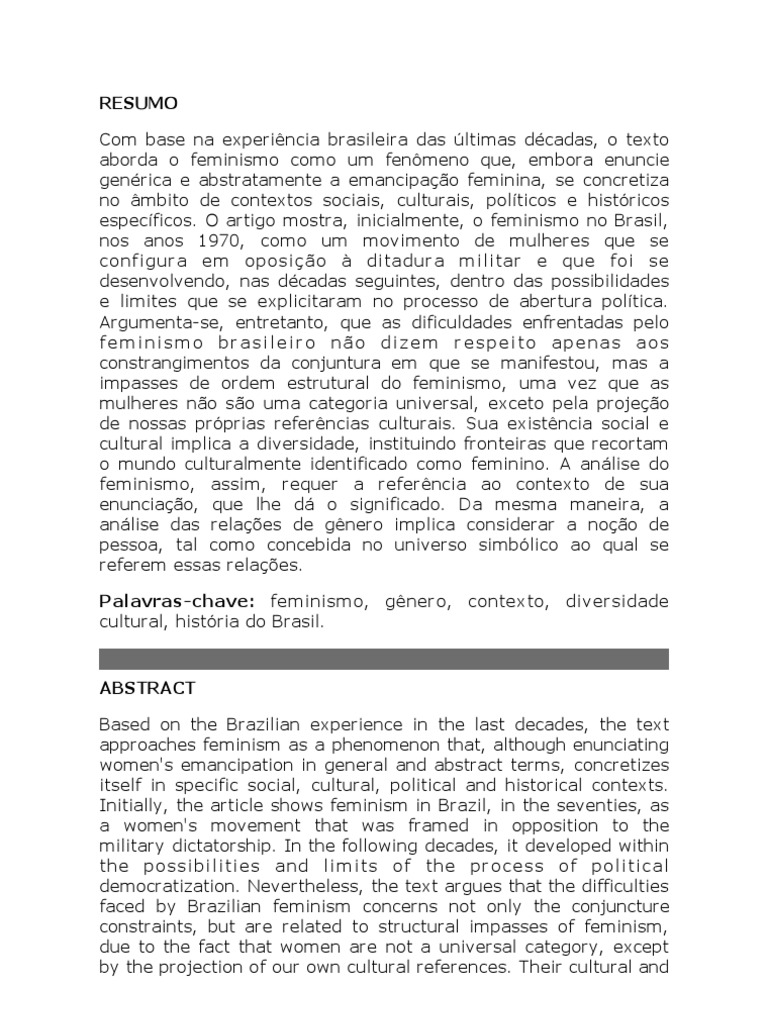enuncie genrica e abstratamente a emancipao feminina, se concretiza no mbito de contextos sociais, culturais, polticos e histricos especficos. O artigo mostra, inicialmente, o feminismo no Brasil, nos anos 1970, como um movimento de mulheres que se conf i gur a em oposi o di tadur a mi l i tar e que f oi se desenvolvendo, nas dcadas seguintes, dentro das possibilidades e limites que se explicitaram no processo de abertura poltica. Argumenta-se, entretanto, que as dificuldades enfrentadas pelo f e m i ni s m o b r a s i l e i r o n o d i z e m r e s p e i t o a p e na s a o s constrangimentos da conjuntura em que se manifestou, mas a impasses de ordem estrutural do feminismo, uma vez que as mulheres no so uma categoria universal, exceto pela projeo de nossas prprias referncias culturais. Sua existncia social e cultural implica a diversidade, instituindo fronteiras que recortam o mundo culturalmente identificado como feminino. A anlise do feminismo, assim, requer a referncia ao contexto de sua enunciao, que lhe d o significado. Da mesma maneira, a anlise das relaes de gnero implica considerar a noo de pessoa, tal como concebida no universo simblico ao qual se referem essas relaes. Palavras-chave: feminismo, gnero, contexto, diversidade cultural, histria do Brasil.