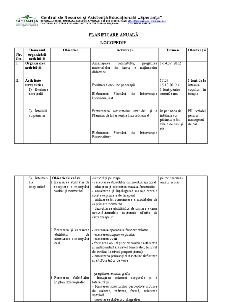 Domeniul Nr. organizrii Crt. activit ii I. Organizarea activit ii II. Activitate terapeutic 1) Evaluare a iniial Obiective Amenajarea materialelor didactice Activit i cabinetului, de lucru, a Termen pregtirea 1-14.09. 2012 mijloacelor 17.0915.10.2012 / 1 lun pentru Intervenie cazurile noi 1 lun de la intrarea copiilor n terapie Observa ii