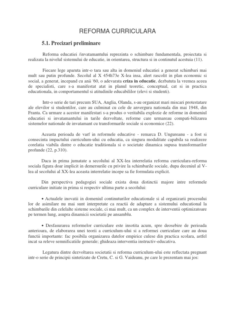 Integrarea reformei curriculare in reformele globale ale societatii. Reforma in curriculum semnifica o orientare reformista esentiala in educatie, iar prin efectele indirecte, pe termen mediu si lung, ea insasi determina schimbari in toate subsistemele sociale. Reforma trebuie sa reflecte obiectivele globale de dezvoltare a societatii. Aceasta implica o buna circulatie a informatiei legate de proiectul de reforma si de implementarea acesteia, consultari permanente intre cadrele didactice, receptivitate din partea autoritatilor. Aceste consultari si dezbateri, conduse cu profesionalism, reprezinta nu doar o modalitate de sensibilizare, constientizare si informare /explicare, ci si un veritabil training de pre-initiere a cadrelor didactice in infaptuirea reformei. Structurile necesare unei reforme curriculare depasesc cadrul sistemului de educatie. Ele presupun schimbari si la nivelul structurilor celorlalte subsisteme ale societatii. Reforma curriculara nu devine realitate sociala si pedagogica decat daca reuseste sa transforme, cu timpul, practica educationala (relatiile didactice, relatia scolii cu familia si comunitatea, climatul educational al scolii, mentalitatile etc.). Reforma curriculara trebuie conceputa ca reprezentand o activitate continua si perfectibila. O astfel de interpretare a reformei, ca inovare permanenta, nu conduce la instabilitate tensionata, ci dimpotriva, este modalitatea cea mai eficienta de a evita schimbarile bruste, discontinuitatile violente, incoerentele inevitabile in perioade de reforma precipitata. Reforma curriculara trebuie sa fie conceputa si aplicata in interdependenta cu realizarea educatiei permanente. Educatia permanenta definita drept procesul de perfectionare a dezvoltarii personale, sociale si profesionale pe durata intregii vieti a fiintei umane, deschide perspective de proiectare si realizare a curriculum-ului. Spre deosebire de viziunea traditionala (cand se elabora un curriculum pentru fiecare nivel al sistemului de invatamant) pedagogia moderna vorbeste despre curriculum-urile educatiei permanente, astfel incat sa nu se piarda din vedere 'deschiderea educatiei permanente si multiplicarea aspectelor ei pentru fiecare individ in cursul vietii lui si pentru fiecare faza a vietii sale' (14, p.88).
