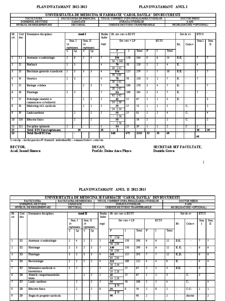 PLAN INVATAMANT ANUL II 2012-2013 UNIVERSITATEA DE MEDICINA SI FARMACIE CAROL DAVILA DIN BUCURESTI