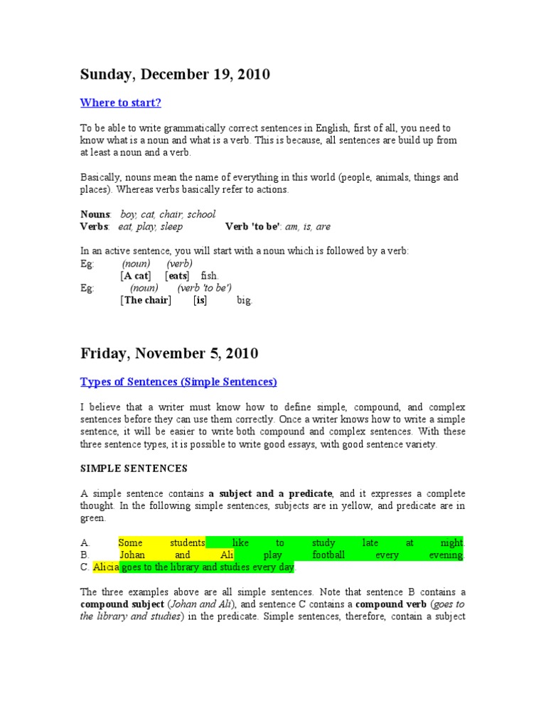 To be able to write grammatically correct sentences in English, first of all, you need to know what is a noun and what is a verb. This is because, all sentences are build up from at least a noun and a verb. Basically, nouns mean the name of everything in this world (people, animals, things and places). Whereas verbs basically refer to actions. Nouns: boy, cat, chair, school Verbs: eat, play, sleep Verb 'to be': am, is, are In an active sentence, you will start with a noun which is followed by a verb: Eg: (noun) (verb) [A cat] [eats] fish. Eg: (noun) (verb 'to be') [The chair] [is] big.