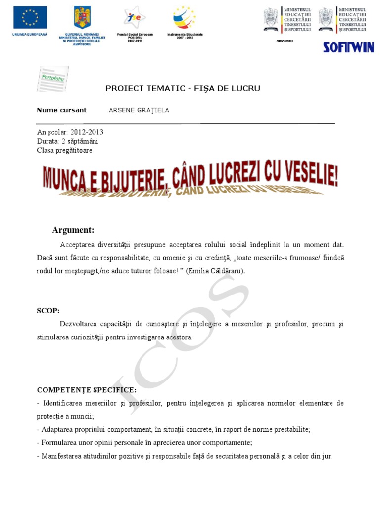 ELABORAREA HRII PROIECTULUI (vezi anexa) SCRISOARE DE INTENIE Dragi prini, v anunm C am dori i noi s-aflm Cte-n lun i n soare Despre munc i a ei valoare. O vorb am auzit: C dei are miros, Orice munc-i cu folos. Bunul este preuit INVENTAR DE ACTIVITI DE NVARE: ACTIVITI DE DEZVOLTARE PERSONAL: ntlniri de diminea: -Primirea copiilor: deprinderi de comunicare; - Salutul consemnarea prezenei; - Completarea calendarului naturii; - Gustarea deprinderi igienice i de autoservire; - Autocunoatere: Eu sunt...i a vreau s fiu...!; Sunt vesel sau trist. Cum m manifest?; - Deprinderi de independen n aciune: Singurel muncesc,/ Lucrul s l preuiesc! - Deprinderi de a lucra n echip: mpreun noi lucrm,/Munca o valorizm!; - Abiliti de comunicare: Cnd intervin n conversaie?; Cum ascult o conversaie?; - Dezvoltarea empatiei: Ce ie nu-i place, altuia nu-i face!; Ba al meu, ba al tu, ba mpreun. - Deprinderi de negociere: Probleme de am avea, cu rbdare le vom rezolva!; - Deprinderi de ordine: Servim ordonat acum...micul dejun. - Luarea deciziilor: Am greit n grupul de prieteni. Cum procedez?; - Deprinderi de acceptare a diversitii: Vreau s te cunosc mai bine!. - Activiti opionale: -Educaie ecologic: Din tainele meseriilor: Speologii; Scafandrii; Alpinitii; -Mandale art i relaxare: Instituii; Unelte. Atunci cnd este muncit. Orice lucru ar putea S ne-ajute cu ceva Tema s o lmurim, Bucuroi noi l primim n echip s lucrm, Valoarea s i-o dublm.