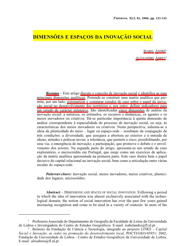 Resumo Este artigo discute o conceito de inovao social e identifica as suas principais dimenses analticas. Pretende-se construir uma matriz analtica que permita, por um lado, sistematizar e comparar estudos de caso sobre o papel da inovao social no desenvolvimento dos territrios e, por outro, definir indicadores para um estudo de carcter extensivo. So identificadas cinco dimenses de anlise da inovao social: a natureza, os estmulos, os recursos e dinmicas, os agentes e os meios inovadores ou criativos. D-se particular importncia quinta dimenso de anlise correspondente espacialidade do processo de inovao social, ou seja, s caractersticas dos meios inovadores ou criativos. Nesta perspectiva, salienta-se a ideia da plasticidade do meio lugar ou espao-rede resultante da conjugao de trs condies: a diversidade, que assegura a abertura ao exterior e a entrada de ideias, atitudes e prticas novas; a tolerncia, que permite o risco, possibilitando, por essa via, a emergncia de inovao; a participao, que promove o debate e o envolvimento dos actores. Na segunda parte do artigo, apresenta-se um estudo de caso exploratrio, o microcrdito em Portugal, que surge como um exerccio de aplicao da matriz analtica apresentada na primeira parte. Este caso ilustra bem o papel decisivo do capital relacional na inovao social, bem como a articulao entre vrias escalas do espao-rede. Palavras-chave: Inovao social, meios inovadores, meios criativos, plasticidade dos lugares, microcrdito. Abstract DIMENSIONS AND SPACES OF SOCIAL INNOVATION. Following a period in which the idea of innovation was almost exclusively associated with the technological domain, the notion of social innovation has over the past few years gained increasing recognition and come to be used in a variety of contexts. In most of the