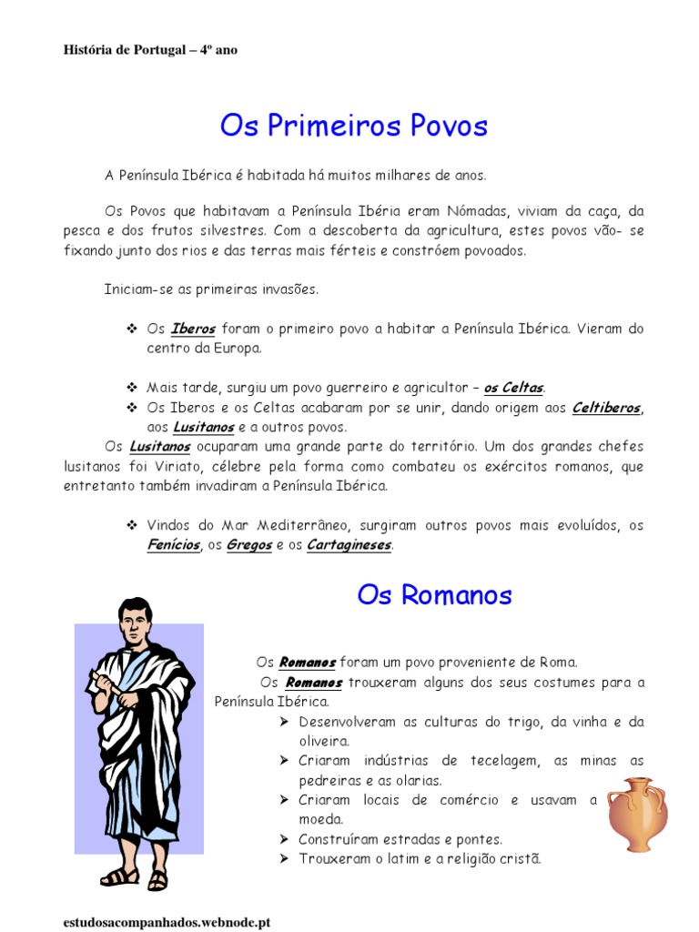 A Pennsula Ibrica habitada h muitos milhares de anos. Os Povos que habitavam a Pennsula Ibria eram Nmadas, viviam da caa, da pesca e dos frutos silvestres. Com a descoberta da agricultura, estes povos vo- se fixando junto dos rios e das terras mais frteis e constrem povoados. Iniciam-se as primeiras invases. Os Iberos foram o primeiro povo a habitar a Pennsula Ibrica. Vieram do centro da Europa. Mais tarde, surgiu um povo guerreiro e agricultor os Celtas. Os Iberos e os Celtas acabaram por se unir, dando origem aos Celtiberos, aos Lusitanos e a outros povos. Os Lusitanos ocuparam uma grande parte do territrio. Um dos grandes chefes lusitanos foi Viriato, clebre pela forma como combateu os exrcitos romanos, que entretanto tambm invadiram a Pennsula Ibrica. Vindos do Mar Mediterrneo, surgiram outros povos mais evoludos, os Fencios, os Gregos e os Cartagineses.