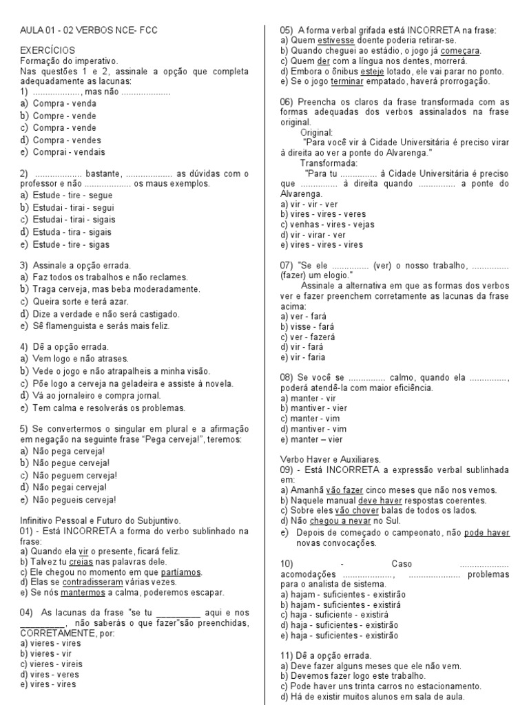 05) A forma verbal grifada est INCORRETA na frase: a) Quem estivesse doente poderia retirar-se. b) Quando cheguei ao estdio, o jogo j comeara. c) Quem der com a lngua nos dentes, morrer. d) Embora o nibus esteje lotado, ele vai parar no ponto. e) Se o jogo terminar empatado, haver prorrogao. 06) Preencha os claros da frase transformada com as formas adequadas dos verbos assinalados na frase original. Original: "Para voc vir Cidade Universitria preciso virar direita ao ver a ponte do Alvarenga." Transformada: "Para tu ............... Cidade Universitria preciso que ............... direita quando ............... a ponte do Alvarenga. a) vir - vir - ver b) vires - vires - veres c) venhas - vires - vejas d) vir - virar - ver e) vires - vires - vires 07) "Se ele ............... (ver) o nosso trabalho, ............... (fazer) um elogio." Assinale a alternativa em que as formas dos verbos ver e fazer preenchem corretamente as lacunas da frase acima: a) ver - far b) visse - far c) ver - fazer d) vir - far e) vir - faria 08) Se voc se ............... calmo, quando ela ..............., poder atend-la com maior eficincia. a) manter - vir b) mantiver - vier c) manter - vim d) mantiver - vim e) manter vier Verbo Haver e Auxiliares. 09) - Est INCORRETA a expresso verbal sublinhada em: a) Amanh vo fazer cinco meses que no nos vemos. b) Naquele manual deve haver respostas coerentes. c) Sobre eles vo chover balas de todos os lados. d) No chegou a nevar no Sul. e) Depois de comeado o campeonato, no pode haver novas convocaes. 10) Caso .................... acomodaes ...................., ..................... problemas para o analista de sistema. a) hajam - suficientes - existiro b) hajam - suficientes - existir c) haja - suficiente - existir d) haja - suficientes - existiro e) haja - suficientes - existiro 11) D a opo errada. a) Deve fazer alguns meses que ele no vem. b) Devemos fazer logo este trabalho. c) Pode haver uns trinta carros no estacionamento. d) H de existir muitos alunos em sala de aula. 1