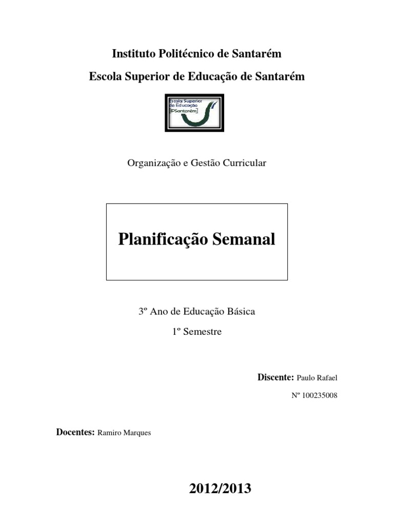 A planificao semanal permitiu-nos realizar uma abordagem profunda, refletida acerca das escolhas pedaggicas a seguir sobre a unidade e rea curricular escolhida. Assim, permitiu-nos integrar os diferentes elementos abordados nas aulas, refletir acerca das competncias e objetivos que pretendemos trabalhar, aprofundar o programa curricular, a forma como est concebido e a prpria forma de avaliar.