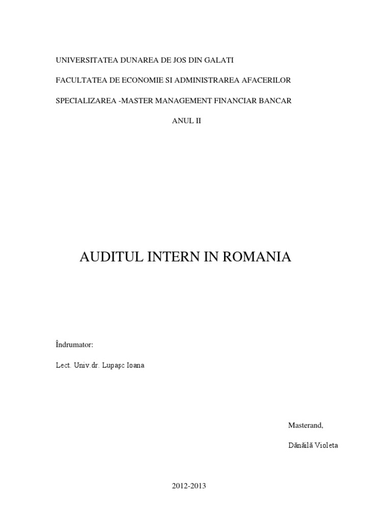 In Romnia problematica auditului intern a fost abordata ncepnd cu anul 2000, aceasta ca urmare a implementrii cu responsabilitate a acquis-ului comunitar in domeniului controlului intern care este alctuit, in mare msur, de principii generale de buna practica acceptate pe plan internaional i naional n Uniunea Europeana. Modalitate in care aceste principii se transpun in sistemele de management si control intern este specifica fiecrei ri innd cont de condiiile constituionale, administrative, legislative, culturale,etc. Funcia de Audit Intern este una relativ recenta deoarece apariia ei (sau reapariia ei, dup unii) se situeaz n perioada crizei economice din 1929 din Statele Unite. Auditul intern este o funcie universala. Acest calificativ trebuie neles din doua puncte de vedere: este o funcie universal deoarece se aplic tuturor organizaiilor, dar este o funcie universal i pentru c se aplic tuturor Funciilor acolo unde aceasta se exercit.1 Auditul public intern ajut, aduce un plus de valoare la buna i efectiva gestiune a fondurilor publice pe care entitatea public le are n administrare. Entitatea public este reprezentat de autoritatea public, instituia public, companie/societate naional, regie autonom, societate comercial la care statul sau o unitate administrativ teritorial este acionar majoritar, cu personalitate juridic, care utilizeaz/administreaz fonduri publice i/sau patrimoniu public. Instituia public reprezint denumirea generica ce include Parlamentul, Administraia Prezideniala, ministerele, celelalte organe de specialitate ale administraiei publice, alte autoriti publice, instituii publice autonome, precum si instituiile din subordinea acestora,indiferent de forma de finanare a acestora. 2 n lucrarea Teoria i practica auditului intern3 scris de Jacques Renard auditul intern este definit ca: 1. Auditul intern este un dispozitiv intern din cadrul ntreprinderii care are ca scop: