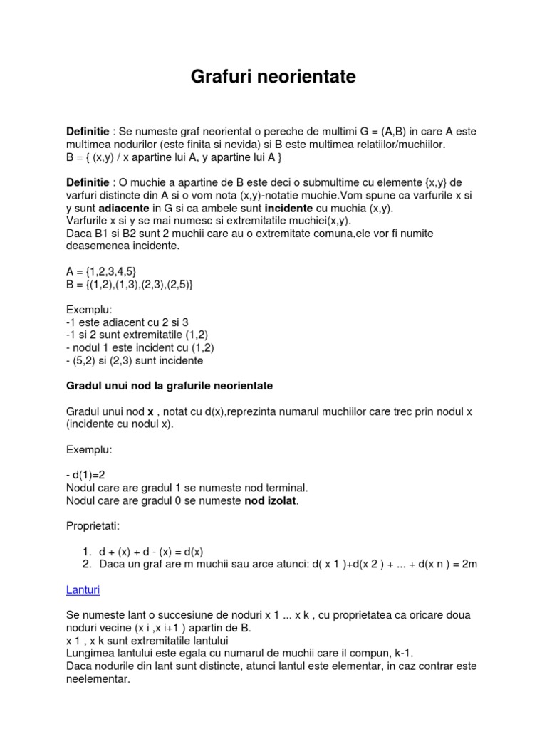 Definitie : Se numeste graf neorientat o pereche de multimi G = (A,B) in care A este multimea nodurilor (este finita si nevida) si B este multimea relatiilor/muchiilor. B = { (x,y) / x apartine lui A, y apartine lui A } Definitie : O muchie a apartine de B este deci o submultime cu elemente {x,y} de varfuri distincte din A si o vom nota (x,y)-notatie muchie.Vom spune ca varfurile x si y sunt adiacente in G si ca ambele sunt incidente cu muchia (x,y). Varfurile x si y se mai numesc si extremitatile muchiei(x,y). Daca B1 si B2 sunt 2 muchii care au o extremitate comuna,ele vor fi numite deasemenea incidente. A = {1,2,3,4,5} B = {(1,2),(1,3),(2,3),(2,5)} Exemplu: -1 este adiacent cu 2 si 3 -1 si 2 sunt extremitatile (1,2) - nodul 1 este incident cu (1,2) - (5,2) si (2,3) sunt incidente Gradul unui nod la grafurile neorientate Gradul unui nod x , notat cu d(x),reprezinta numarul muchiilor care trec prin nodul x (incidente cu nodul x). Exemplu: - d(1)=2 Nodul care are gradul 1 se numeste nod terminal. Nodul care are gradul 0 se numeste nod izolat. Proprietati: 1. d + (x) + d - (x) = d(x) 2. Daca un graf are m muchii sau arce atunci: d( x 1 )+d(x 2 ) + ... + d(x n ) = 2m Lanturi Se numeste lant o succesiune de noduri x 1 ... x k , cu proprietatea ca oricare doua noduri vecine (x i ,x i+1 ) apartin de B. x 1 , x k sunt extremitatile lantului Lungimea lantului este egala cu numarul de muchii care il compun, k-1. Daca nodurile din lant sunt distincte, atunci lantul este elementar, in caz contrar este neelementar.