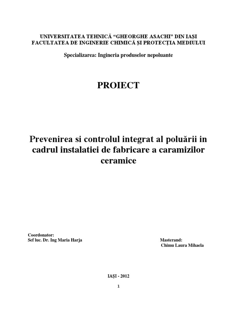 S.C. CERAMICA S.A. Iasi extrage argila, produce si comercializeaza caramizi si blocuri ceramice pentru zidarie portanta si neportanta in sectiile Ceramica 1, 2 si 3. Principalele faze ale fluxului tehnologic de fabricatie sunt: extragere argila preparare materie prima fasonare produse uscare produse ardere/sortare/ambalare/evacuare produse finite livrare CARIERA: Extragerea argilei se face in cariera situata la aproximativ 1 km distanta, langa satul Vladiceni, comuna Tomesti. Argila derocata din Dealul Blanaru, este haldata in vatra carierei pentru macerare, timp de 6-12 luni. Argila macerata este incarcata in mijloace auto si transportata in depozitul tampon al sectiei Alimentare-Preparare. Utilajele din flux: tractoare S 1500 si S 1501, echipate cu lama de buldozer si scarificator; excavator electric E 303; excavator termic; autobasculante de 16 tone. SECTIA ALIMENTARE-PREPARARE se prelucreaza materia prima in vederea fasonarii produselor ceramice. Halele destinate operatiei de alimentare cu argila si cenusa sunt compuse din doua corpuri de cladire (un corp pentri alimentatoarele de argila si un corp pentru alimentatorul de cenusa) cu o Stotala = 625 mp. Din mijloacele auto, argila este descarcata treptat in cuva alimentatorului, iar prin intermediul unui releu de benzi situate la inaltime, pe estacada, pe structura metalica, amplasata pe suporti din beton, realizand in acest sens supratraversarea raului Vamasoaia, argila este transportata in sectia Preparare unde are loc procesul de maruntire-omogenizare. Linia de preparare are o capacitate de 143 tone/h, asigura necesarul de materie prima pentru desfasurarea fluxurilor tehnologice in cadrul halelor de fabricatie conform capacitatilor proiectate. Hala de preparare este compusa din doua corpuri distincte: una este sala masinilor cu S = 1.535 mp, iar cealalta este silozul de stocare o cuva din beton armat cu 3 compartimente si un Vutil = 7500 mc cu S = 2.040 mp. SECTIA CERAMICA 1: Activitatea sectiei Ceramica1 se desfoar ntr-o hal tehnologic pe o linie de fabricatie noua, cu o capacitate proiectata de 300 t/zi, respectiv 105.000t/an producie - blocuri ceramice. Corespunzator capacitatii proiectate, necesarul de materii prime pentru desfasurarea fluxului tehnologic este: