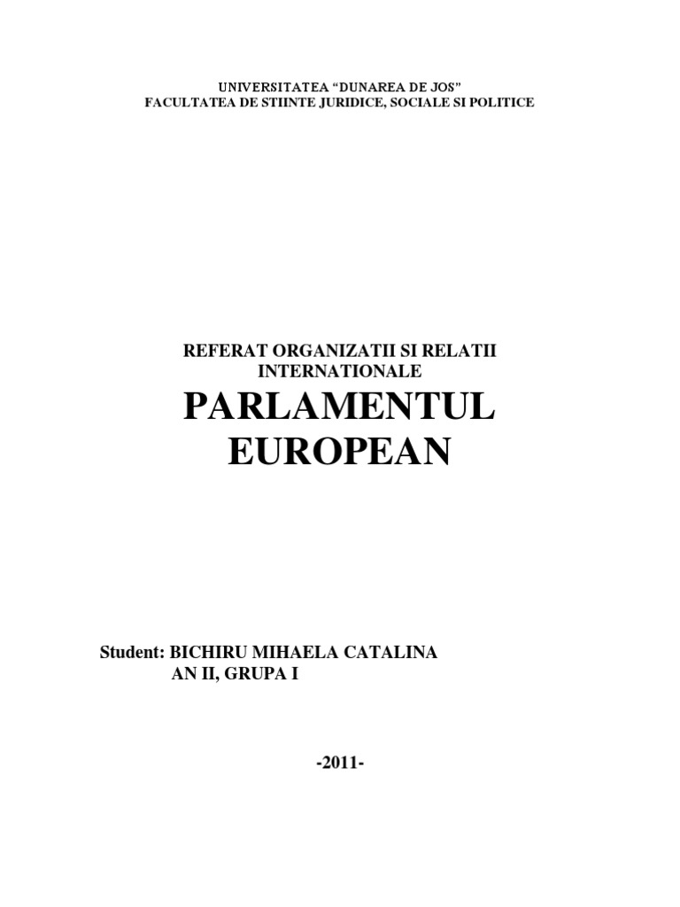 alege membrii unui parlament unic. Europenii nu ar fi putut gsi un simbol mai puternic al reconcilierii. Parlamentul European, a crui legitimitate deriv din sufragiul universal direct, este ales la fiecare cinci ani; de-a lungul timpului, el a acumulat constant putere i influen, printr-o serie de tratate. Aceste tratate, n special Tratatul de la Maastricht din 1992 i Tratatul de la Amsterdam din 1997, au transformat Parlamentul European dintr-un organism pur consultativ ntr-un parlament legislativ, cu puteri similare cu cele ale parlamentelor naionale. Parlamentul European este singura instituie comunitar care se ntlnete i i ine dezbaterile n public. Dezbaterile, opiniile i rezoluiile Parlamentului se public n Monitorul Oficial al Uniunii Europene. 2. Presedintia, Biroul i Conferinta Presedintilor Presedintele reprezint Parlamentul n situaii oficiale i n relaiile internaionale, prezideaz edinele plenare i ntlnirile Biroului i Conferinei Preedinilor. Biroul este organul regulator care este responsabil cu bugetul Parlamentului i rspunde de chestiuni administrative, de organizare i de personal. Pe lng Preedinte i cei paisprezece vicepreedini, acesta mai include cinci chestori care ocup o poziie consultativ n chestiunile administrative i financiare legate de Membri i de Statutul acestora. Membrii Biroului sunt alei cu un mandat de doi ani i jumtate. Conferinta Presedintilor cuprinde Preedintele Parlamentului i preedinii grupurilor politice; ea este organismul politic conductor al Parlamentului. Conferina elaboreaz agenda pentru sesiunile plenare, stabilete orarul activitii organismelor parlamentare i termenii de referin i dimensiunea comisiilor i delegaiilor parlamentare.