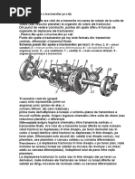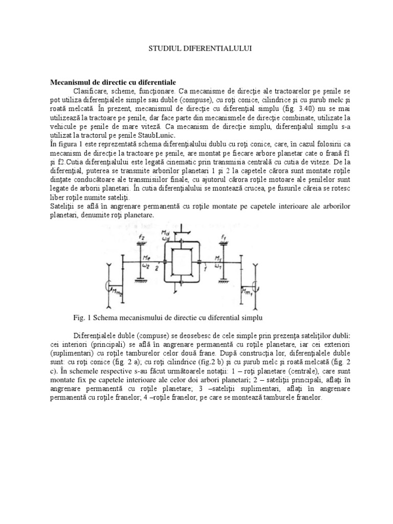 Mecanismul de directie cu diferentiale Clasificare, scheme, funcionare. Ca mecanisme de direcie ale tractoarelor pe enile se pot utiliza diferenialele simple sau duble (compuse), cu roi conice, cilindrice i cu urub melc i roat melcat. n prezent, mecanismul de direcie cu diferenial simplu (fig. 3.40) nu se mai utilizeaz la tractoare pe enile, dar face parte din mecanismele de direcie combinate, utilizate la vehicule pe enile de mare vitez. Ca mecanism de direcie simplu, diferenialul simplu s-a utilizat la tractorul pe enile StaubLunic. n figura 1 este reprezentat schema diferenialului dublu cu roi conice, care, n cazul folosirii ca mecanism de direcie la tractoare pe enile, are montat pe fiecare arbore planetar cate o fran f1 i [Link] diferenialului este legat cinematic prin transmisia central cu cutia de viteze. De la diferenial, puterea se transmite arborilor planetari 1 i 2 la capetele crora sunt montate roile dinate conductoare ale transmisiilor finale, cu ajutorul crora roile motoare ale enilelor sunt legate de arborii planetari. n cutia diferenialului se monteaz crucea, pe fusurile creia se rotesc liber roile numite satelii. Sateliii se afl n angrenare permanent cu roile montate pe capetele interioare ale arborilor planetari, denumite roi planetare.