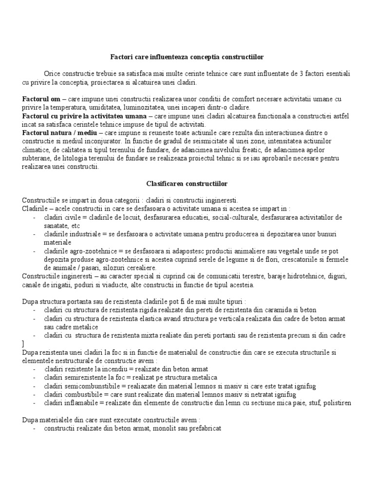 influentate de 3 factori esentiali cu privire la conceptia, proiectarea si alcatuirea unei cladiri. Factorul om care impune unei constructii realizarea unor conditii de comfort necesare activitatii umane cu privire la temperatura, umiditatea, luminozitatea, unei incaperi dintr-o cladire. Factorul cu privire la activitatea umana care impune unei cladiri alcatuirea functionala a constructiei astfel incat sa satisfaca cerintele tehnice impuse de tipul de activitati. Factorul natura / mediu care impune si reuneste toate actiunile care rezulta din interactiunea dintre o constructie si mediul inconjurator. In functie de gradul de seismicitate al unei zone, intensitatea actiunilor climatice, de calitatea si tipul terenului de fundare, de adancimea nivelului freatic, de adancimea apelor subterane, de litologia terenului de fundare se realizeaza proiectul tehnic si se iau aprobarile necesare pentru realizarea unei constructii. Clasificarea constructiilor Constructiile se impart in doua categorii : cladiri si constructii ingineresti. Cladirile acele constructii in care se desfasoara o activitate umana si acestea se impart in : - cladiri civile = cladirile de locuit, desfasurarea educatiei, social-culturale, desfasurarea activitatilor de sanatate, etc - cladirile industriale = se desfasoara o activitate umana pentru producerea si depozitarea unor bunuri materiale - cladirile agro-zootehnice = se desfasoara si adapostesc productii animaliere sau vegetale unde se pot depozita produse agro-zootehnice si acestea cuprind serele de legume si de flori, crescatoriile si fermele de animale / pasari, silozuri cerealiere. Constructiile ingineresti au caracter special si cuprind cai de comunicatii terestre, baraje hidrotehnice, diguri, canale de irigatii, poduri si viaducte, alte constructii in functie de tipul acesteia. Dupa structura portanta sau de rezistenta cladirile pot fi de mai multe tipuri : - cladiri cu structura de rezistenta rigida realizate din pereti de rezistenta din caramida si beton - cladiri cu structura de rezistenta elastica avand structura pe verticala realizata din cadre de beton armat sau cadre metalice - cladiri cu structura de rezistenta mixta realiate din pereti portanti sau de rezistenta precum si din cadre ] Dupa rezistenta unei cladiri la foc si in functie de materialul de constructie din care se executa structurile si elementele nestructurale de constructie avem : - cladiri rezistente la incendiu = realizate din beton armat - cladiri semirezistente la foc = realizat pe structura metalica - cladiri semicombunstibile = realiazate din material lemnos si masiv si care este tratat ignifug - cladiri combustibile = care sunt realizate din material lemnos masiv si netratat ignifug - cladiri inflamabile = realizate din elemente de constructie din lemn cu sectiune mica paie, stuf, polistiren Dupa materialele din care sunt executate constructiile avem : - constructii realizate din beton armat, monolit sau prefabricat