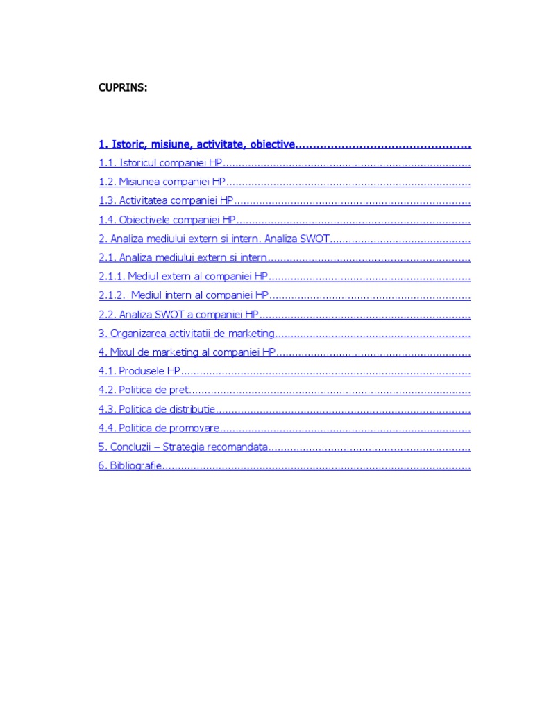 1. Istoric, misiune, activitate, obiective ................................................. 1.1. Istoricul companiei HP............................................................................... 1.2. Misiunea companiei HP.............................................................................. 1.3. Activitatea companiei HP........................................................................... 1.4. Obiectivele companiei HP.......................................................................... 2. Analiza mediului extern si intern. Analiza SWOT............................................. 2.1. Analiza mediului extern si intern................................................................ 2.1.1. Mediul extern al companiei HP................................................................ 2.1.2. Mediul intern al companiei HP................................................................ 2.2. Analiza SWOT a companiei HP................................................................... 3. Organizarea activitatii de marketing.............................................................. 4. Mixul de marketing al companiei HP.............................................................. 4.1. Produsele HP............................................................................................ 4.2. Politica de pret.......................................................................................... 4.3. Politica de distributie................................................................................. 4.4. Politica de promovare................................................................................ 5. Concluzii Strategia recomandata................................................................ 6. Bibliografie..................................................................................................