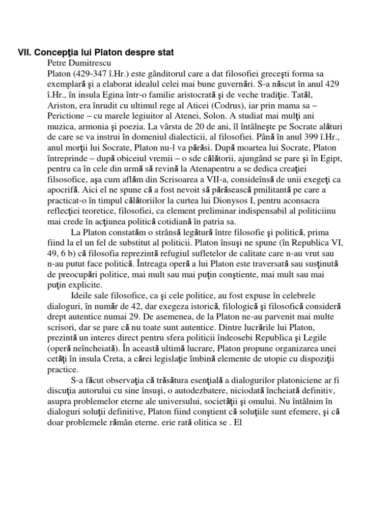 ) este gnditorul care a dat filosofiei greceti forma sa exemplar i a elaborat idealul celei mai bune guvernri. S-a nscut n anul 429 .Hr., n insula Egina ntr-o familie aristocrat i de veche tradiie. Tatl, Ariston, era nrudit cu ultimul rege al Aticei (Codrus), iar prin mama sa Perictione cu marele legiuitor al Atenei, Solon. A studiat mai muli ani muzica, armonia i poezia. La vrsta de 20 de ani, l ntlnete pe Socrate alturi de care se va instrui n domeniul dialecticii, al filosofiei. Pn n anul 399 .Hr., anul morii lui Socrate, Platon nu-l va prsi. Dup moartea lui Socrate, Platon ntreprinde dup obiceiul vremii o sde cltorii, ajungnd se pare i n Egipt, pentru ca n cele din urm s revin la Atenapentru a se dedica creaiei filsosofice, aa cum aflm din Scrisoarea a VII-a, considens de unii exegei ca apocrif. Aici el ne spune c a fost nevoit s prseasc pmilitant pe care a practicat-o n timpul cltoriilor la curtea lui Dionysos I, pentru aconsacra refleciei teoretice, filosofiei, ca element preliminar indispensabil al politiciinu mai crede n aciunea politic cotidian n patria sa. La Platon constatm o strns legtur ntre filosofie i politic, prima fiind la el un fel de substitut al politicii. Platon nsui ne spune (n Republica VI, 49, 6 b) c filosofia reprezint refugiul sufletelor de calitate care n-au vrut sau n-au putut face politic. ntreaga oper a lui Platon este traversat sau susinut de preocupri politice, mai mult sau mai puin contiente, mai mult sau mai puin explicite. Ideile sale filosofice, ca i cele politice, au fost expuse n celebrele dialoguri, n numr de 42, dar exegeza istoric, filologic i filosofic consider drept autentice numai 29. De asemenea, de la Platon ne-au parvenit mai multe scrisori, dar se pare c nu toate sunt autentice. Dintre lucrrile lui Platon, prezint un interes direct pentru sfera politicii ndeosebi Republica i Legile (oper nencheiat). n aceast ultim lucrare, Platon propune organizarea unei ceti n insula Creta, a crei legislaie mbin elemente de utopie cu dispoziii practice. S-a fcut observaia c trstura esenial a dialogurilor platoniciene ar fi discuia autorului cu sine nsui, o autodezbatere, niciodat ncheiat definitiv, asupra problemelor eterne ale universului, societii i omului. Nu ntlnim n dialoguri soluii definitive, Platon fiind contient c soluiile sunt efemere, i c doar problemele rmn eterne. erie rat olitica se . El