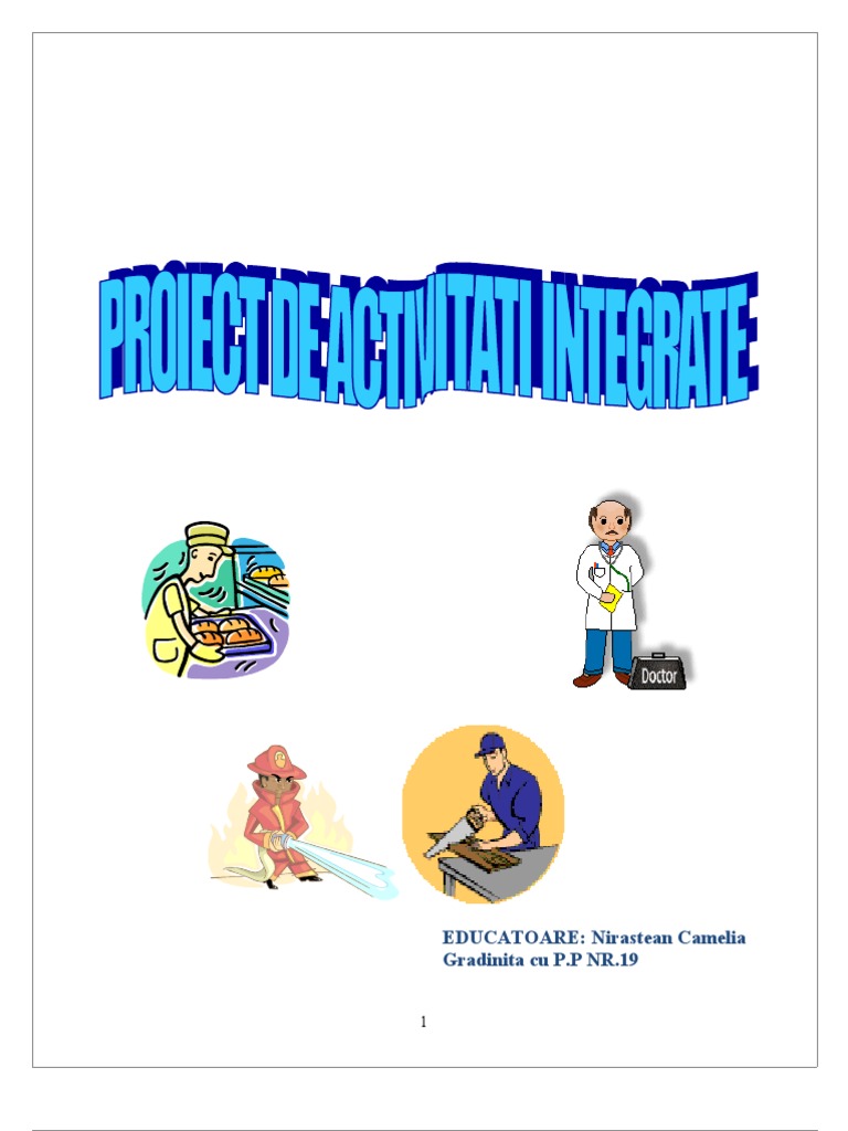 DATA: 30 aprilie 2011 TEMA DE STUDIU: CINE SI CUM PLANIFICA/ORGANIZEAZA O ACTIVITATE/ TEMA PROIECTULUI: Invat de mic SUBTEMA PROIECTULUI:Cine face, ce facesi cu ce? TEMA ZILEI: Meseria, bratara de aur NIVELUL II DURATA:1 zi FORMA DE REALIZARE:Activitate integrat SCOPUL ACTIVITII: - consolidarea cunostintelor referitoare le diverse profesii si meserii; -activizarea vocabularului cu cuvinte referitoare la profesii, meserii,verbe reprezentand actiuni specifice,unelte , produse; -dezvoltarea comportamentelor de cooperare , prosociale; -consolidarea deprinderii de a manui materialul didactic pus la dispozitie. CENTRE DE INTERES: CONSTRUCTII: Ca sute pentru pasarele ARTA: Meseriasi pe role de hartie DOMENII EXPERIENIALE: Obiective de referinta vizate: DLC:- sa participe la activitatile de grup, inclusiv la cele de joc,atat in calitate de vorbitor, cat si in calitate de ascultator; - sa recunoasca si sa utilizeze litere ale alfabetului scris; -sa se exprime oral corect din punct de vedere fonetic, lexical si gramatical. DOS:- sa fie capabil sa realizeze lucrari practice inspirate din natura , valorificand deprinderile de lucru; ACTIVITI PE CENTRE DE INTERES: CONSTRUCTII: Casute pentru pasarele -sa utilizeze corect materialele de lucru ; -sa imbine scadurelele pentru a realiza cerinta; -sa colaboreze pentru a indeplini sarcina enuntata. Materiale folosite:bucatele de lemn, ciocan, cuie. ART: Meseriasi pe role de hartie -sa utilizeze corect materialele puse la dispozitie pentru realizarea temei date; -sa coloreze, sa decupeze dupa contur si sa lipeasca partile componente ale omuletilor de hartie: Materiale folosite: role de la hartie igienica, imagini, lipici, foarfece. SCENARIUL ZILEI