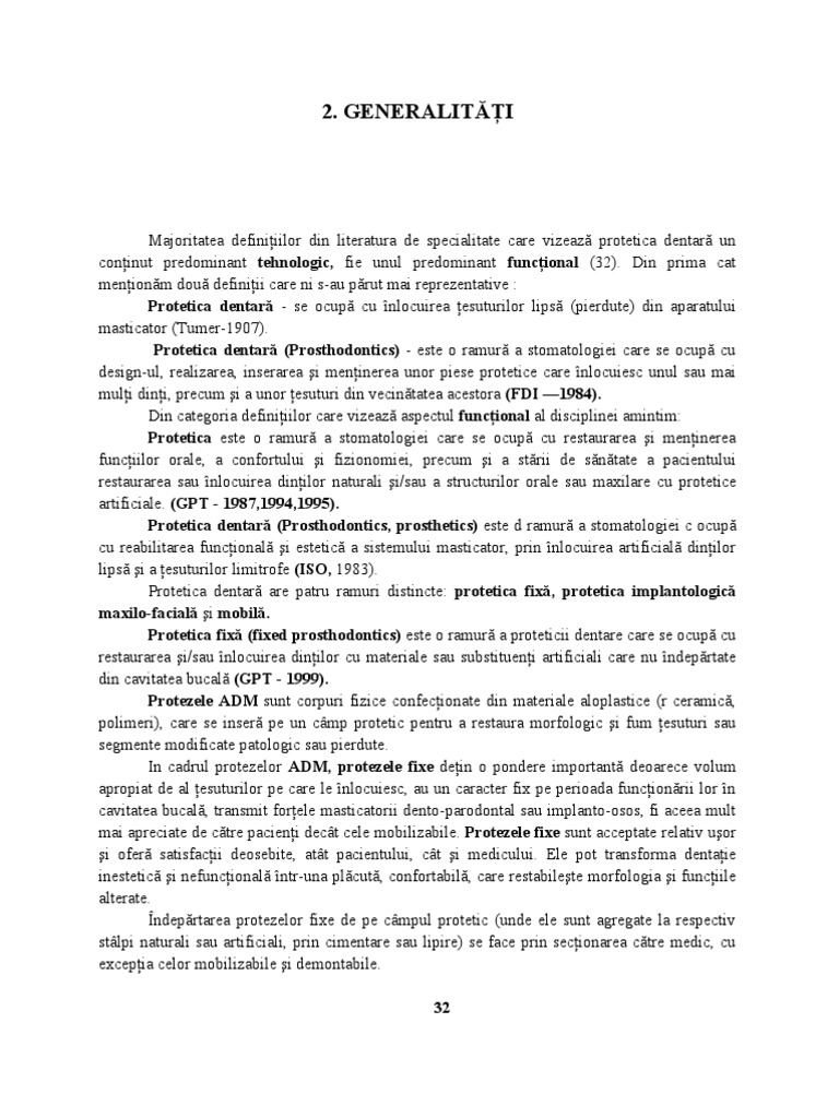 Majoritatea definiiilor din literatura de specialitate care vizeaz protetica dentar un coninut predominant tehnologic, fie unul predominant funcional (32). Din prima cat menionm dou definiii care ni s-au prut mai reprezentative : Protetica dentar - se ocup cu nlocuirea esuturilor lips (pierdute) din aparatului masticator (Tumer-1907). Protetica dentar (Prosthodontics) - este o ramur a stomatologiei care se ocup cu design-ul, realizarea, inserarea i meninerea unor piese protetice care nlocuiesc unul sau mai muli dini, precum i a unor esuturi din vecintatea acestora (FDI 1984). Din categoria definiiilor care vizeaz aspectul funcional al disciplinei amintim: Protetica este o ramur a stomatologiei care se ocup cu restaurarea i meninerea funciilor orale, a confortului i fizionomiei, precum i a strii de sntate a pacientului restaurarea sau nlocuirea dinilor naturali i/sau a structurilor orale sau maxilare cu protetice artificiale. (GPT - 1987,1994,1995). Protetica dentar (Prosthodontics, prosthetics) este d ramur a stomatologiei c ocup cu reabilitarea funcional i estetic a sistemului masticator, prin nlocuirea artificial dinilor lips i a esuturilor limitrofe (ISO, 1983). Protetica dentar are patru ramuri distincte: protetica fix, protetica implantologic maxilo-facial i mobil. Protetica fix (fixed prosthodontics) este o ramur a proteticii dentare care se ocup cu restaurarea i/sau nlocuirea dinilor cu materiale sau substitueni artificiali care nu ndeprtate din cavitatea bucal (GPT - 1999). Protezele ADM sunt corpuri fizice confecionate din materiale aloplastice (r ceramic, polimeri), care se inser pe un cmp protetic pentru a restaura morfologic i fum esuturi sau segmente modificate patologic sau pierdute. In cadrul protezelor ADM, protezele fixe dein o pondere important deoarece volum apropiat de al esuturilor pe care le nlocuiesc, au un caracter fix pe perioada funcionrii lor n cavitatea bucal, transmit forele masticatorii dento-parodontal sau implanto-osos, fi aceea mult mai apreciate de ctre pacieni dect cele mobilizabile. Protezele fixe sunt acceptate relativ uor i ofer satisfacii deosebite, att pacientului, ct i medicului. Ele pot transforma dentaie inestetic i nefuncional ntr-una plcut, confortabil, care restabilete morfologia i funciile alterate. ndeprtarea protezelor fixe de pe cmpul protetic (unde ele sunt agregate la respectiv stlpi naturali sau artificiali, prin cimentare sau lipire) se face prin secionarea ctre medic, cu excepia celor mobilizabile i demontabile. 32
