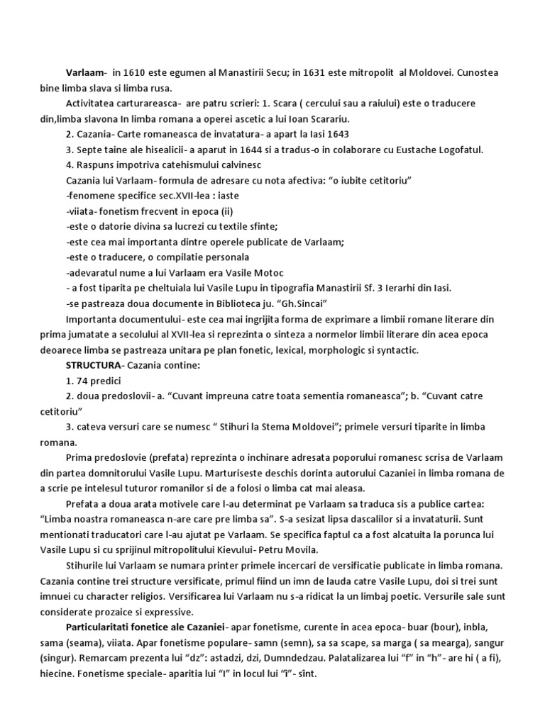 Cunostea bine limba slava si limba rusa. Activitatea carturareasca- are patru scrieri: 1. Scara ( cercului sau a raiului) este o traducere din,limba slavona In limba romana a operei ascetic a lui Ioan Scarariu. 2. Cazania- Carte romaneasca de invatatura- a apart la Iasi 1643 3. Septe taine ale hisealicii- a aparut in 1644 si a tradus-o in colaborare cu Eustache Logofatul. 4. Raspuns impotriva catehismului calvinesc Cazania lui Varlaam- formula de adresare cu nota afectiva: o iubite cetitoriu -fenomene specifice [Link]-lea : iaste -viiata- fonetism frecvent in epoca (ii) -este o datorie divina sa lucrezi cu textile sfinte; -este cea mai importanta dintre operele publicate de Varlaam; -este o traducere, o compilatie personala -adevaratul nume a lui Varlaam era Vasile Motoc - a fost tiparita pe cheltuiala lui Vasile Lupu in tipografia Manastirii Sf. 3 Ierarhi din Iasi. -se pastreaza doua documente in Biblioteca ju. [Link] Importanta documentului- este cea mai ingrijita forma de exprimare a limbii romane literare din prima jumatate a secolului al XVII-lea si reprezinta o sinteza a normelor limbii literare din acea epoca deoarece limba se pastreaza unitara pe plan fonetic, lexical, morphologic si syntactic. STRUCTURA- Cazania contine: 1. 74 predici 2. doua predoslovii- a. Cuvant impreuna catre toata sementia romaneasca; b. Cuvant catre cetitoriu 3. cateva versuri care se numesc Stihuri la Stema Moldovei; primele versuri tiparite in limba romana. Prima predoslovie (prefata) reprezinta o inchinare adresata poporului romanesc scrisa de Varlaam din partea domnitorului Vasile Lupu. Marturiseste deschis dorinta autorului Cazaniei in limba romana de a scrie pe intelesul tuturor romanilor si de a folosi o limba cat mai aleasa. Prefata a doua arata motivele care l-au determinat pe Varlaam sa traduca sis a publice cartea: Limba noastra romaneasca n-are care pre limba sa. S-a sesizat lipsa dascalilor si a invataturii. Sunt mentionati traducatori care l-au ajutat pe Varlaam. Se specifica faptul ca a fost alcatuita la porunca lui Vasile Lupu si cu sprijinul mitropolitului Kievului- Petru Movila. Stihurile lui Varlaam se numara printer primele incercari de versificatie publicate in limba romana. Cazania contine trei structure versificate, primul fiind un imn de lauda catre Vasile Lupu, doi si trei sunt imnuei cu character religios. Versificarea lui Varlaam nu s-a ridicat la un limbaj poetic. Versurile sale sunt considerate prozaice si expressive. Particularitati fonetice ale Cazaniei- apar fonetisme, curente in acea epoca- buar (bour), inbla, sama (seama), viiata. Apar fonetisme populare- samn (semn), sa sa scape, sa marga ( sa mearga), sangur (singur). Remarcam prezenta lui dz: astadzi, dzi, Dumndedzau. Palatalizarea lui f in h- are hi ( a fi), hiecine. Fonetisme speciale- aparitia lui I in locul lui - snt.
