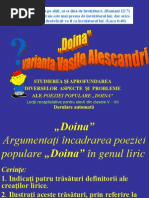 sunt exprimate sentimente de dor, de jale, de revolt, de dragoste, etc.. Doinele se clasific n funcie de sentimentele pe care le exprim. Ca orice creaie popular, doina are autor anonim, caracter colectiv (la scrierea ei au contribuit mai muli creatori anonimi) ,oral(a fost transmis prin viu grai din generaie n generaie)i sincretic ( poezia se mbin cu muzica). Nu exist o definiie a doinei. Ea este un simbol al existenei spirituale a romnului i fiecare o definete prin prisma propriilor sentimente i prin prisma modului de receptare. Vasile Alecsandri definete doina ca pe cea mai vie expresie a sufletului romnesc. Titlul este ntotdeauna sugestiv. El numete specia literar, fiind redat printr-un substantiv comun, articulat. Este o invocare reluat i n alte versuri i definete specia genului liric, individualiznd-o. Poezia nu este structurat pe strofe i sentimentele dominante pe care le exprim sunt dorul i jalea. Adresarea direct, plin de afectivitate, este realizat prin intermediul repetiiei substantivului doin, n cazul vocativ. Este o mrturisire direct a profundei impresii pe care doina o imprim sufletului romnesc. Pentru a exprima stri sufleteti diverse, autorul anonim descrie propriile triri, evideniind prezena doinei n fiecare anotimp. Aceasta apare personificat, n dialog cu poetul, iar alternana pronumelor de persoana I i a II-a evideniaz structurarea versurilor sub forma unui monolog. Este reliefat comuniunea sufleteasc perfect cu omul din popor, cele dou epitete ale doinei crend un paralelism cu efecte sonore: cntic dulce, viers cu foc. ntregul ciclu natural, sugerat n poezie prin prezena anotimpurilor, este asociat cu bogia tririlor sufleteti, a gndurilor i sentimentelor poporului romn. Anotimpurile i ncep drumul cu primvara n care renaterea naturii aduce bucurie. Verbul a ngna d for expresiv versurilor, alturi de personificarea florilor i a privighetorilor: Eu cnt doina pe afar De m-ngn cu florile i privighetorile. Tonul poetic este aici vesel. Verbul cnt, la timpul prezent, apare n text obsesiv, de cinci ori, n relaie cu termenul cheie doin, indicnd prezena eu-lui liric. Strilor sufleteti diferite le corespund rostiri diferite: cnt, suspin. Astfel, iarna este redat cu ajutorul epitetului viscoloas, tonul poeziei devenind trist, iar doina este acum de jale, de dor: Eu cnt doina-nchis n cas De-mi mai mngi zilele, zilele i nopile.