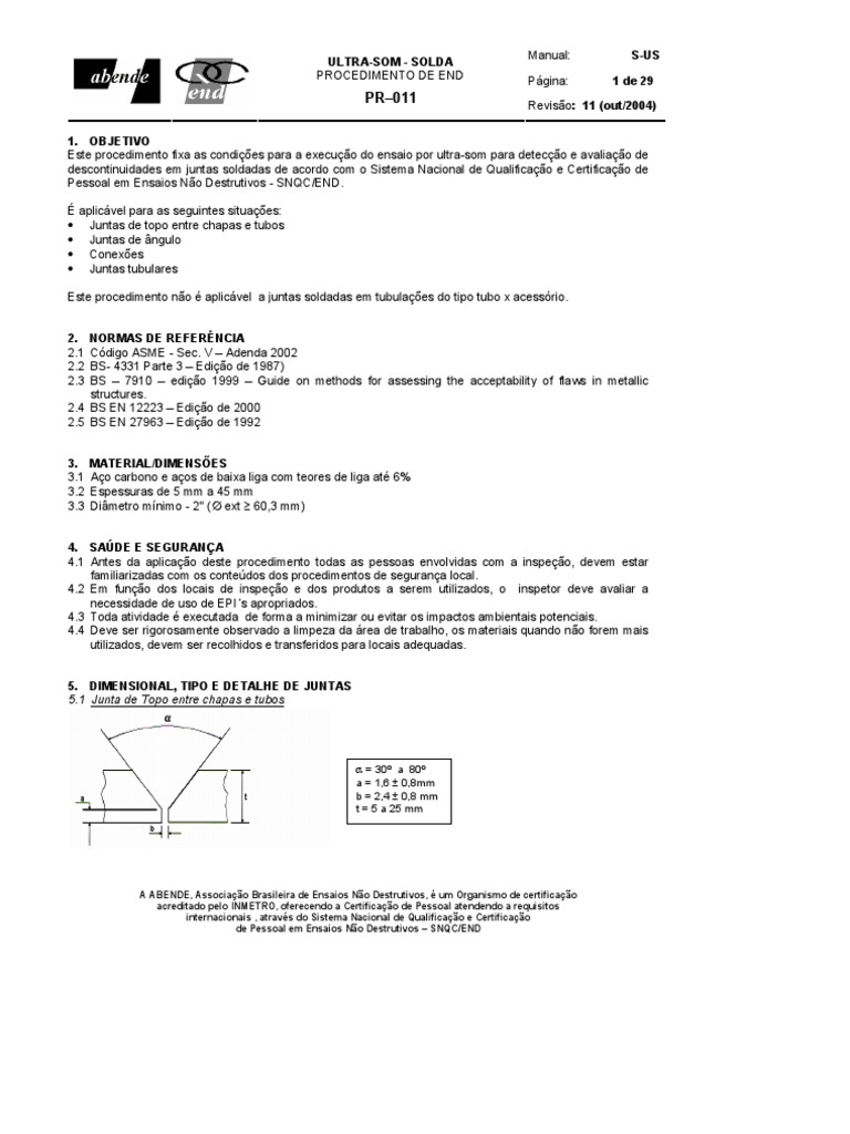 1. OBJETIVO Este procedimento fixa as condies para a execuo do ensaio por ultra-som para deteco e avaliao de descontinuidades em juntas soldadas de acordo com o Sistema Nacional de Qualificao e Certificao de Pessoal em Ensaios No Destrutivos - SNQC/END. aplicvel para as seguintes situaes: Juntas de topo entre chapas e tubos Juntas de ngulo Conexes Juntas tubulares Este procedimento no aplicvel a juntas soldadas em tubulaes do tipo tubo x acessrio. 2. 2.1 2.2 2.3 NORMAS DE REFERNCIA Cdigo ASME - Sec. V Adenda 2002 BS- 4331 Parte 3 Edio de 1987) BS 7910 edio 1999 Guide on methods for assessing the acceptability of flaws in metallic structures. 2.4 BS EN 12223 Edio de 2000 2.5 BS EN 27963 Edio de 1992 3. 3.1 3.2 3.3 MATERIAL/DIMENSES Ao carbono e aos de baixa liga com teores de liga at 6% Espessuras de 5 mm a 45 mm Dimetro mnimo - 2" ( ext 60,3 mm)