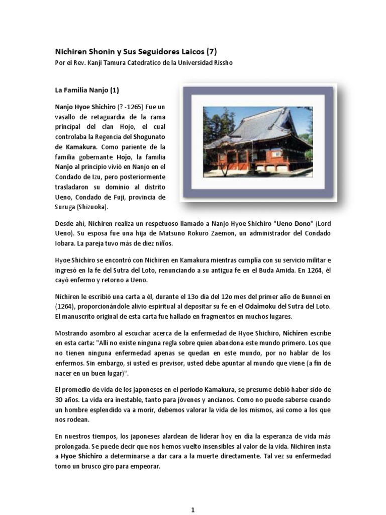 Nanjo Hyoe Shichiro (? -1265) Fue un vasallo de retaguardia de la rama principal del clan Hojo, el cual controlaba la Regencia del Shogunato de Kamakura. Como pariente de la familia gobernante Hojo, la familia Nanjo al principio vivi en Nanjo en el Condado de Izu, pero posteriormente trasladaron su dominio al distrito Ueno, Condado de Fuji, provincia de Suruga (Shizuoka). Desde ah, Nichiren realiza un respetuoso llamado a Nanjo Hyoe Shichiro "Ueno Dono" (Lord Ueno). Su esposa fue una hija de Matsuno Rokuro Zaemon, un administrador del Condado Iobara. La pareja tuvo ms de diez nios. Hyoe Shichiro se encontr con Nichiren en Kamakura mientras cumpla con su servicio militar e ingres en la fe del Sutra del Loto, renunciando a su antigua fe en el Buda Amida. En 1264, l cay enfermo y retorno a Ueno. Nichiren le escribi una carta a l, durante el 13o da del 12o mes del primer ao de Bunnei en (1264), proporcionndole alivio espiritual al depositar su fe en el Odaimoku del Sutra del Loto. El manuscrito original de esta carta fue hallado en fragmentos en muchos lugares. Mostrando asombro al escuchar acerca de la enfermedad de Hyoe Shichiro, Nichiren escribe en esta carta: "All no existe ninguna regla sobre quien abandona este mundo primero. Los que no tienen ninguna enfermedad apenas se quedan en este mundo, por no hablar de los enfermos. Sin embargo, si usted es previsor, usted debe apuntar al mundo que viene (a fin de nacer en un buen lugar)". El promedio de vida de los japoneses en el perodo Kamakura, se presume debi haber sido de 30 aos. La vida era inestable, tanto para jvenes y ancianos. Como no puede saberse cuando un hombre esplendido va a morir, debemos valorar la vida de los mismos, as como a los que nos rodean. En nuestros tiempos, los japoneses alardean de liderar hoy en da la esperanza de vida ms prolongada. Se puede decir que nos hemos vuelto insensibles al valor de la vida. Nichiren insta a Hyoe Shichiro a determinarse a dar cara a la muerte directamente. Tal vez su enfermedad tomo un brusco giro para empeorar.