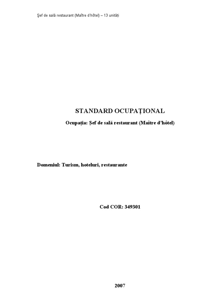 Echipa de validare / Refereni de specialitate: Standardul a fost validat de specialiti desemnai de Comitetul Sectorial Turism, Hoteluri i Restaurante: Auric PRAPALEA maistru instructor THR-CG Paul SOARE maistru instructor THR-CG Nina GOVOR ef sal restaurant PARC Minerva CRSTEA ef sal restaurant PARC