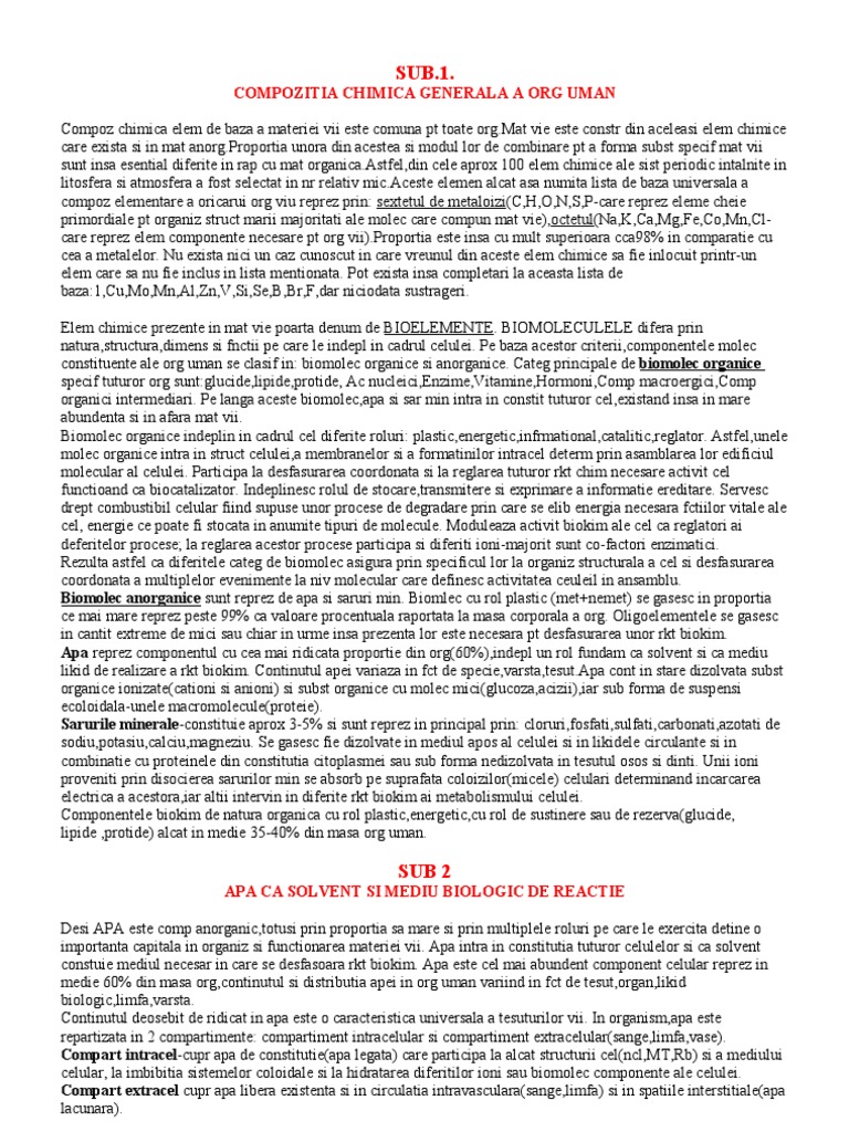COMPOZITIA CHIMICA GENERALA A ORG UMAN Compoz chimica elem de baza a materiei vii este comuna pt toate [Link] vie este constr din aceleasi elem chimice care exista si in mat [Link] unora din acestea si modul lor de combinare pt a forma subst specif mat vii sunt insa esential diferite in rap cu mat [Link],din cele aprox 100 elem chimice ale sist periodic intalnite in litosfera si atmosfera a fost selectat in nr relativ [Link] elemen alcat asa numita lista de baza universala a compoz elementare a oricarui org viu reprez prin: sextetul de metaloizi(C,H,O,N,S,P-care reprez eleme cheie primordiale pt organiz struct marii majoritati ale molec care compun mat vie),octetul(Na,K,Ca,Mg,Fe,Co,Mn,Clcare reprez elem componente necesare pt org vii).Proportia este insa cu mult superioara cca98% in comparatie cu cea a metalelor. Nu exista nici un caz cunoscut in care vreunul din aceste elem chimice sa fie inlocuit printr-un elem care sa nu fie inclus in lista mentionata. Pot exista insa completari la aceasta lista de baza:1,Cu,Mo,Mn,Al,Zn,V,Si,Se,B,Br,F,dar niciodata sustrageri. Elem chimice prezente in mat vie poarta denum de BIOELEMENTE. BIOMOLECULELE difera prin natura,structura,dimens si fnctii pe care le indepl in cadrul celulei. Pe baza acestor criterii,componentele molec constituente ale org uman se clasif in: biomolec organice si anorganice. Categ principale de biomolec organice specif tuturor org sunt:glucide,lipide,protide, Ac nucleici,Enzime,Vitamine,Hormoni,Comp macroergici,Comp organici intermediari. Pe langa aceste biomolec,apa si sar min intra in constit tuturor cel,existand insa in mare abundenta si in afara mat vii. Biomolec organice indeplin in cadrul cel diferite roluri: plastic,energetic,infrmational,catalitic,reglator. Astfel,unele molec organice intra in struct celulei,a membranelor si a formatinilor intracel determ prin asamblarea lor edificiul molecular al celulei. Participa la desfasurarea coordonata si la reglarea tuturor rkt chim necesare activit cel functioand ca biocatalizator. Indeplinesc rolul de stocare,transmitere si exprimare a informatie ereditare. Servesc drept combustibil celular fiind supuse unor procese de degradare prin care se elib energia necesara fctiilor vitale ale cel, energie ce poate fi stocata in anumite tipuri de molecule. Moduleaza activit biokim ale cel ca reglatori ai deferitelor procese; la reglarea acestor procese participa si diferiti ioni-majorit sunt co-factori enzimatici. Rezulta astfel ca diferitele categ de biomolec asigura prin specificul lor la organiz structurala a cel si desfasurarea coordonata a multiplelor evenimente la niv molecular care definesc activitatea ceuleil in ansamblu. Biomolec anorganice sunt reprez de apa si saruri min. Biomlec cu rol plastic (met+nemet) se gasesc in proportia ce mai mare reprez peste 99% ca valoare procentuala raportata la masa corporala a org. Oligoelementele se gasesc in cantit extreme de mici sau chiar in urme insa prezenta lor este necesara pt desfasurarea unor rkt biokim. Apa reprez componentul cu cea mai ridicata proportie din org(60%),indepl un rol fundam ca solvent si ca mediu likid de realizare a rkt biokim. Continutul apei variaza in fct de specie,varsta,[Link] cont in stare dizolvata subst organice ionizate(cationi si anioni) si subst organice cu molec mici(glucoza,acizii),iar sub forma de suspensi ecoloidala-unele macromolecule(proteie). Sarurile minerale-constituie aprox 3-5% si sunt reprez in principal prin: cloruri,fosfati,sulfati,carbonati,azotati de sodiu,potasiu,calciu,magneziu. Se gasesc fie dizolvate in mediul apos al celulei si in likidele circulante si in combinatie cu proteinele din constitutia citoplasmei sau sub forma nedizolvata in tesutul osos si dinti. Unii ioni proveniti prin disocierea sarurilor min se absorb pe suprafata coloizilor(micele) celulari determinand incarcarea electrica a acestora,iar altii intervin in diferite rkt biokim ai metabolismului celulei. Componentele biokim de natura organica cu rol plastic,energetic,cu rol de sustinere sau de rezerva(glucide, lipide ,protide) alcat in medie 35-40% din masa org uman.