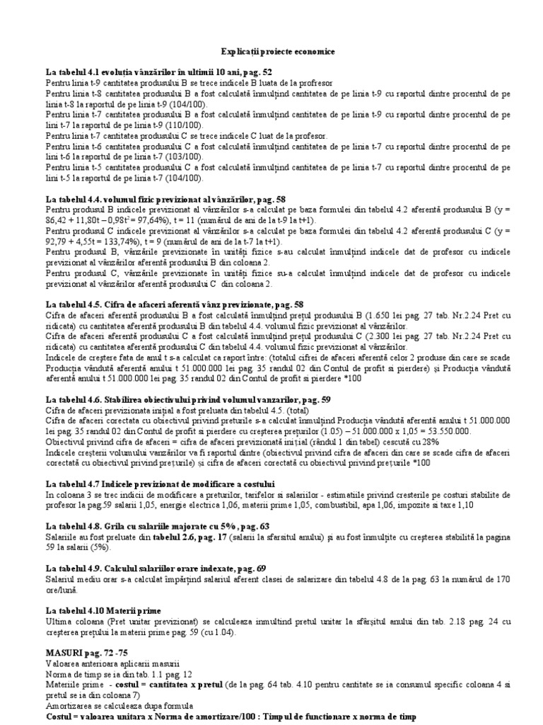 La tabelul 4.5. Cifra de afaceri aferent vnz previzionate, pag. 58 Cifra de afaceri aferent produsului B a fost calculat nmulind preul produsului B (1.650 lei pag. 27 tab. Nr.2.24 Pret cu ridicata) cu cantitatea aferent produsului B din tabelul 4.4. volumul fizic previzionat al vnzrilor. Cifra de afaceri aferent produsului C a fost calculat nmulind preul produsului C (2.300 lei pag. 27 tab. Nr.2.24 Pret cu ridicata) cu cantitatea aferent produsului C din tabelul 4.4. volumul fizic previzionat al vnzrilor. Indicele de cretere fata de anul t s-a calculat ca raport ntre: (totalul cifrei de afaceri aferent celor 2 produse din care se scade Producia vndut aferent anului t 51.000.000 lei pag. 35 randul 02 din Contul de profit si pierdere) i Producia vndut aferent anului t 51.000.000 lei pag. 35 randul 02 din Contul de profit si pierdere *100 La tabelul 4.6. Stabilirea obiectivului privind volumul vanzarilor, pag. 59 Cifra de afaceri previzionata iniial a fost preluata din tabelul 4.5. (total) Cifra de afaceri corectata cu obiectivul privind preturile s-a calculat nmulind Producia vndut aferent anului t 51.000.000 lei pag. 35 randul 02 din Contul de profit si pierdere cu creterea preurilor (1.05) 51.000.000 x 1,05 = 53.550.000. Obiectivul privind cifra de afaceri = cifra de afaceri previzionat iniial (rndul 1 din tabel) cescut cu 28% Indicele creterii volumului vanzrilor va fi raportul dintre (obiectivul privind cifra de afaceri din care se scade cifra de afaceri corectat cu obiectivul privind preurile) i cifra de afaceri corectat cu obiectivul privind preurile *100 La tabelul 4.7 Indicele previzionat de modificare a costului In coloana 3 se trec indicii de modificare a preturilor, tarifelor si salariilor - estimatiile privind cresterile pe costuri stabilite de profesor la pag.59 salarii 1,05, energie electrica 1,06, materii prime 1,05, combustibil, apa 1,06, impozite si taxe 1,10 La tabelul 4.8. Grila cu salariile majorate cu 5% , pag. 63 Salariile au fost preluate din tabelul 2.6, pag. 17 (salarii la sfarsitul anului) i au fost nmulite cu creterea stabilit la pagina 59 la salarii (5%). La tabelul 4.9. Calculul salariilor orare indexate, pag. 69 Salariul mediu orar s-a calculat mprind salariul aferent clasei de salarizare din tabelul 4.8 de la pag. 63 la numrul de 170 ore/lun. La tabelul 4.10 Materii prime Ultima coloana (Pret unitar previzionat) se calculeaza inmultind pretul unitar la sfritul anului din tab. 2.18 pag. 24 cu creterea preului la materii prime pag. 59 (cu 1.04). MASURI pag. 72 -75 Valoarea anterioara aplicarii masurii Norma de timp se ia din tab. 1.1 pag. 12 Materiile prime - costul = cantitatea x pretul (de la pag. 64 tab. 4.10 pentru cantitate se ia consumul specific coloana 4 si pretul se ia din coloana 7) Amortizarea se calculeaza dupa formula Costul = valoarea unitara x Norma de amortizare/100 : Timpul de functionare x norma de timp