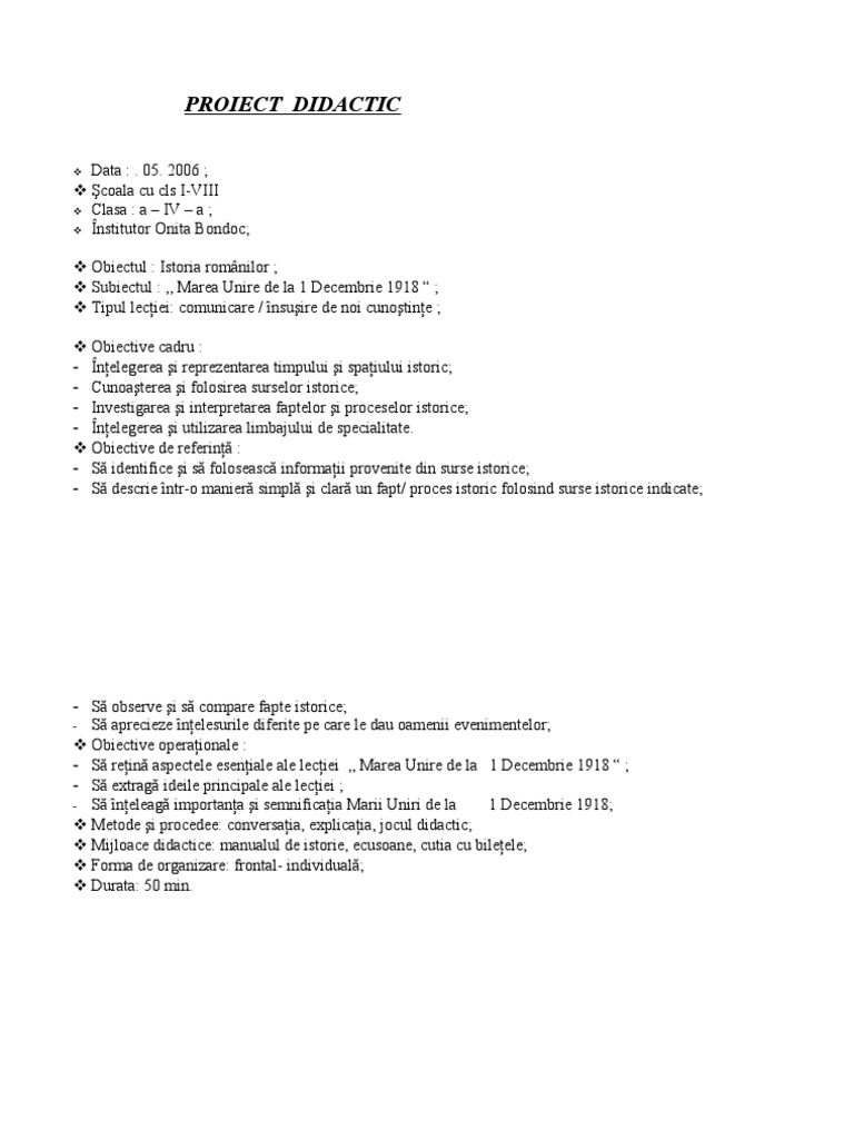 Obiectul : Istoria romnilor ; Subiectul : ,, Marea Unire de la 1 Decembrie 1918 ; Tipul leciei: comunicare / nsuire de noi cunotine ; Obiective cadru : - nelegerea i reprezentarea timpului i spaiului istoric; - Cunoaterea i folosirea surselor istorice; - Investigarea i interpretarea faptelor i proceselor istorice; - nelegerea i utilizarea limbajului de specialitate. Obiective de referin : - S identifice i s foloseasc informaii provenite din surse istorice; - S descrie ntr-o manier simpl i clar un fapt/ proces istoric folosind surse istorice indicate;