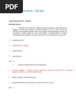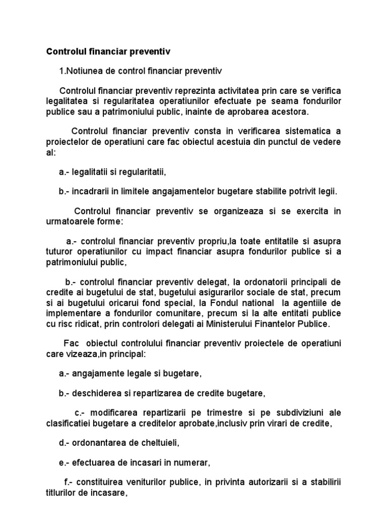Notiunea de control financiar preventiv Controlul financiar preventiv reprezinta activitatea prin care se verifica legalitatea si regularitatea operatiunilor efectuate pe seama fondurilor publice sau a patrimoniului public, inainte de aprobarea acestora. Controlul financiar preventiv consta in verificarea sistematica a proiectelor de operatiuni care fac obiectul acestuia din punctul de vedere al: a.- legalitatii si regularitatii, b.- incadrarii in limitele angajamentelor bugetare stabilite potrivit legii. Controlul financiar preventiv se organizeaza si se exercita in urmatoarele forme: a.- controlul financiar preventiv propriu,la toate entitatile si asupra tuturor operatiunilor cu impact financiar asupra fondurilor publice si a patrimoniului public, b.- controlul financiar preventiv delegat, la ordonatorii principali de credite ai bugetului de stat, bugetului asigurarilor sociale de stat, precum si ai bugetului oricarui fond special, la Fondul national la agentiile de implementare a fondurilor comunitare, precum si la alte entitati publice cu risc ridicat, prin controlori delegati ai Ministerului Finantelor Publice. Fac obiectul controlului financiar preventiv proiectele de operatiuni care vizeaza,in principal: a.- angajamente legale si bugetare, b.- deschiderea si repartizarea de credite bugetare, c.- modificarea repartizarii pe trimestre si pe subdiviziuni ale clasificatiei bugetare a creditelor aprobate,inclusiv prin virari de credite, d.- ordonantarea de cheltuieli, e.- efectuarea de incasari in numerar, f.- constituirea veniturilor publice, in privinta autorizarii si a stabilirii titlurilor de incasare,