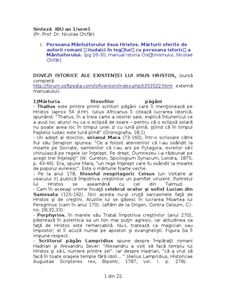 Mrturii oferite de autorii romani i iudaici n legtur cu persoana istoric a Mntuitorului. (pg 26-30, manual Istoria Cretinismului, Nicolae Chifr) DOVEZI ISTORICE ALE EXISTENEI LUI IISUS HRISTOS. (surs complet [Link] extern manualului) 1)Mrturia filosofilor pgni - Thallus este printre primii scriitori pgni care l menioneaz pe Hristos (aprox 54 [Link]). Iulius Africanus i citeaz lucrarea istoric, spunnd: Thallus, n a treia carte a istoriei sale, explic ntunericul ce a avut loc atunci nu ca o eclips de soare pentru c o eclips solar nu poate avea loc n timpul unei zi cu lun plin, tiind c n timpul Patelui iudaic este lun plin (Cronografia, 18,1) - Un adept al stoicilor, sirianul Mara (73-160), ntr-o scrisoare ctre fiul su Serapion spunea: "Ce a folosit atenienilor c l-au osndit la moarte pe Socrate, samienilor c l-au ars pe Pytagora, evreilor s-l chinuiasc pe regele lor nelept. Pe drept, Dumnezeu i-a rzbunat pe aceti trei nelepi" (W. Cureton, Spicilogium Syriacum, Londra, 1875, p. 43-46). Era, spune Mara, "un rege nelept care fu osndit la moarte de poporul evreiesc". Este o mrturie foarte veche. - Pe la anul 178, filosoful neopitagoric Celsus (un Voltaire al veacului II) public mpotriva cretinilor un pamflet virulent. Portretul lui Hristos se aseamn cu cel din Talmud. - Cam n aceeai vreme nva celebrul orator i sofist Lucian din Samosata (125-192). Nici acesta nu-i cru sarcasmele fa de Hristos i de cretini. Aluziile lui se gsesc n lucrarea Moartea lui Peregrinus (cam n anul 170). (aflm de la Origen, Contra Celsum, C.I. no. 28,32,33). - Porphyrios, n marele su Tratat mpotriva cretinilor (anul 270), pstreaz n polemica sa un ton mai puin agresiv, iar atitudinea sa fa de Hristos este remarcabil. Nu-L trateaz ca magician sau impostor; el i acuz numai pe apostoli i evangheliti. Figura Sa i impune respect. - Scriitorul pgn Lampridius spune despre mpraii romani Hadrian i Alexandru Sever: "Alexandru a voit s fac templu lui Hristos i s-L numere printre zei". Iar despre Hadrian, "c a vrut s fac n toate oraele temple fr idoli... " (Aelius Lampridius, Historicae Augustae Scriptores rex, Biponti, 1787, vol. I. p. 278). 1 din 22