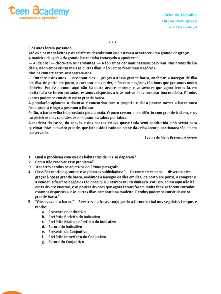 Qual o problema com que os habitantes da ilha se deparam? Como iro resolver esse problema? Transcreve todos os adjetivos do ltimo pargrafo. Classifica morfologicamente as palavras sublinhadas: Durante estes anos disseram eles graas nossa grande barca, andmos a navegar de ilha em ilha, de porto em porto, a comprar e a vender, e fizemos negcios to bons que juntamos muito dinheiro. Por isso, como aqui no h outra rvore enorme, e as poucas rvores que agora temos fazem muita falta se forem cortadas, estamos dispostos a ir s outras ilhas comprar boa madeira. E todos podemos construir outra grande barca. 5. Observavam a barca. Reescreve a frase, conjugando a forma verbal nos seguintes tempos e modos: a. Presente do Indicativo b. Pretrito Perfeito do Indicativo c. Pretrito Mais que Perfeito do Indicativo d. Futuro do Indicativo e. Presente do Conjuntivo f. Pretrito Imperfeito do Conjuntivo g. Futuro do Conjuntivo