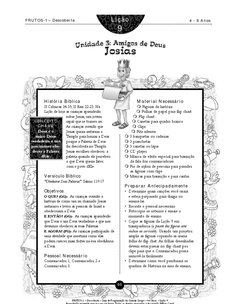 histria de como um rei chamado Josias restaurou e levou as pessoas de Israel a obedecerem a Deus. E ENTO? (GG): As crianas aprendero que Deus um Deus verdadeiro e que ns devemos obedecer as suas Palavras. E AGORA? (PG): As crianas participaro de uma atividade que mostrar como elas podem crescer mais fortes na sua obedincia a Deus. Pessoal Necessrio Comunicador 1, Comunicador 2 e Comunicador 3.
