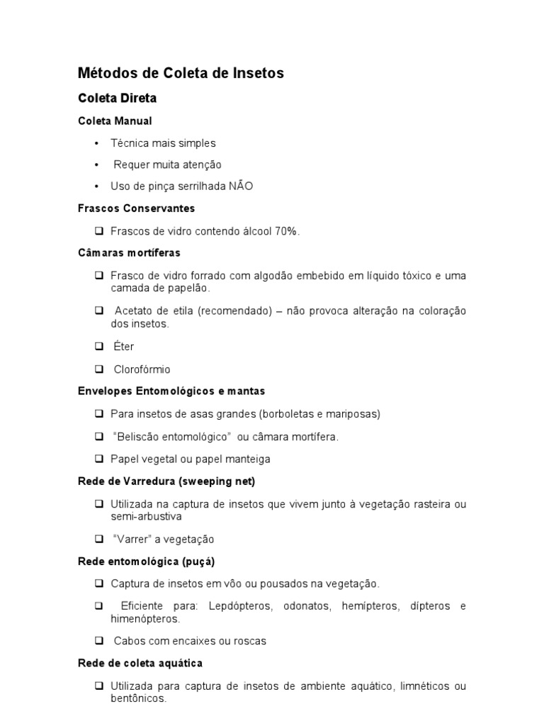 Frascos Conservantes Frascos de vidro contendo lcool 70%. Cmaras mortferas Frasco de vidro forrado com algodo embebido em lquido txico e uma camada de papelo. Acetato de etila (recomendado) no provoca alterao na colorao dos insetos. ter Clorofrmio Envelopes Entomolgicos e mantas Para insetos de asas grandes (borboletas e mariposas) Belisco entomolgico ou cmara mortfera. Papel vegetal ou papel manteiga Rede de Varredura (sweeping net) Utilizada na captura de insetos que vivem junto vegetao rasteira ou semi-arbustiva Varrer a vegetao Rede entomolgica (pu) Captura de insetos em vo ou pousados na vegetao.