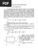 (1.11.12) In legatura cu acest rezultat facem acum o observatie deosebit de importanta (facuta pentru prima oara de [Link]), cu o covarsitoare aplicabilitate practica. Daca intr-o problema ne intereseaza numai starea de tensiune, atunci putem sa ne rezumam la ecuatiile (1.11.12) n care nu intra constantele elastice de material. Asa dar, starea de tensiune intr-o problema plana nu depinde de natura materialului (uneori acest rezultat este cunoscut in literatura sub numele de "Teorema lui Levy". Aceasta concluzie sta la baza aplicariii metodelor optice de studiere a starilor de tensiune cu ajutorul luminii polarizate (fotoelasticimetrie );in aceste cercetari experimentale materialul dat este inlocuit printr-un alt material, transparent, optic activ (cu proprietati de birefrigentaaccidentala) din care se confectioneaza un model al piesei reale. Rezultatele obtinute pe model pot fi astfel transpuse la piesa dintr-un alt material fara a ne pune problema de similitudine; baza teoretica este data de ecuatiile in tensiuni (1.11.12). 1.12. STAREA DE DEFORMATIE PLANA 1. Sa consideram un corp solid deformabil aflat intr-o stare oarecare de eforturi; daca deplasarile tuturor punctelor acestuia se pot produce numai dupa doua directii, adica numai intr-un singur plan, sau altfel spus, daca una din componentele deplasarii (de exemplu w) este egala cu zero iar celalalte doua u si v nu depind de coordonata z corespunzatoare deplasarii w, zicem ca avem cea ce se numeste o stare de deformatie plana. Un exemplu care ilustreaza bine o asemenea stare de solicitare, este dat de un corp deformabil, fixat intre doua placi perfect rigide (fig. 1.10.1) situate la distanta constanta si care este comprimat de forte paralele planele placilor.
